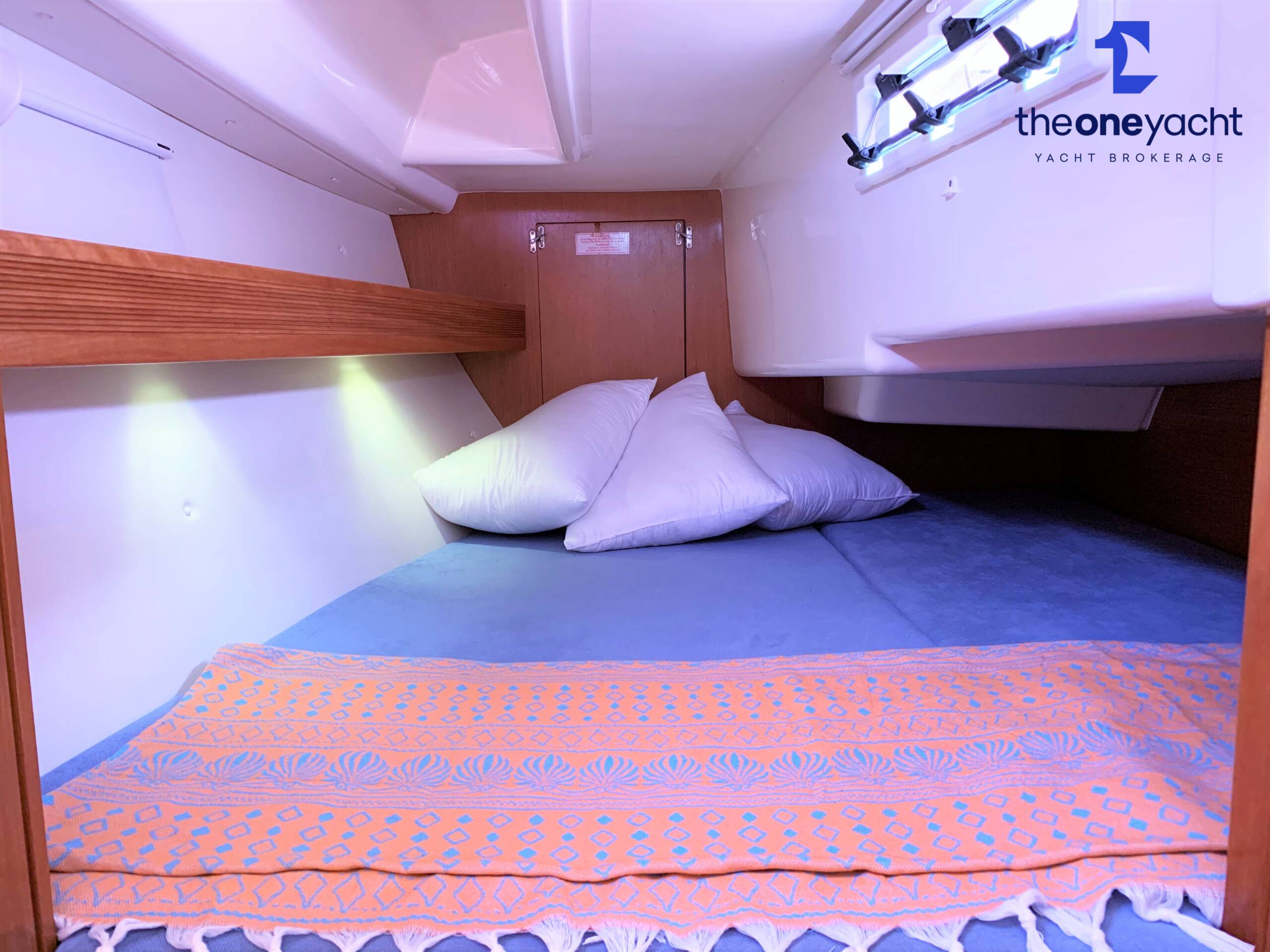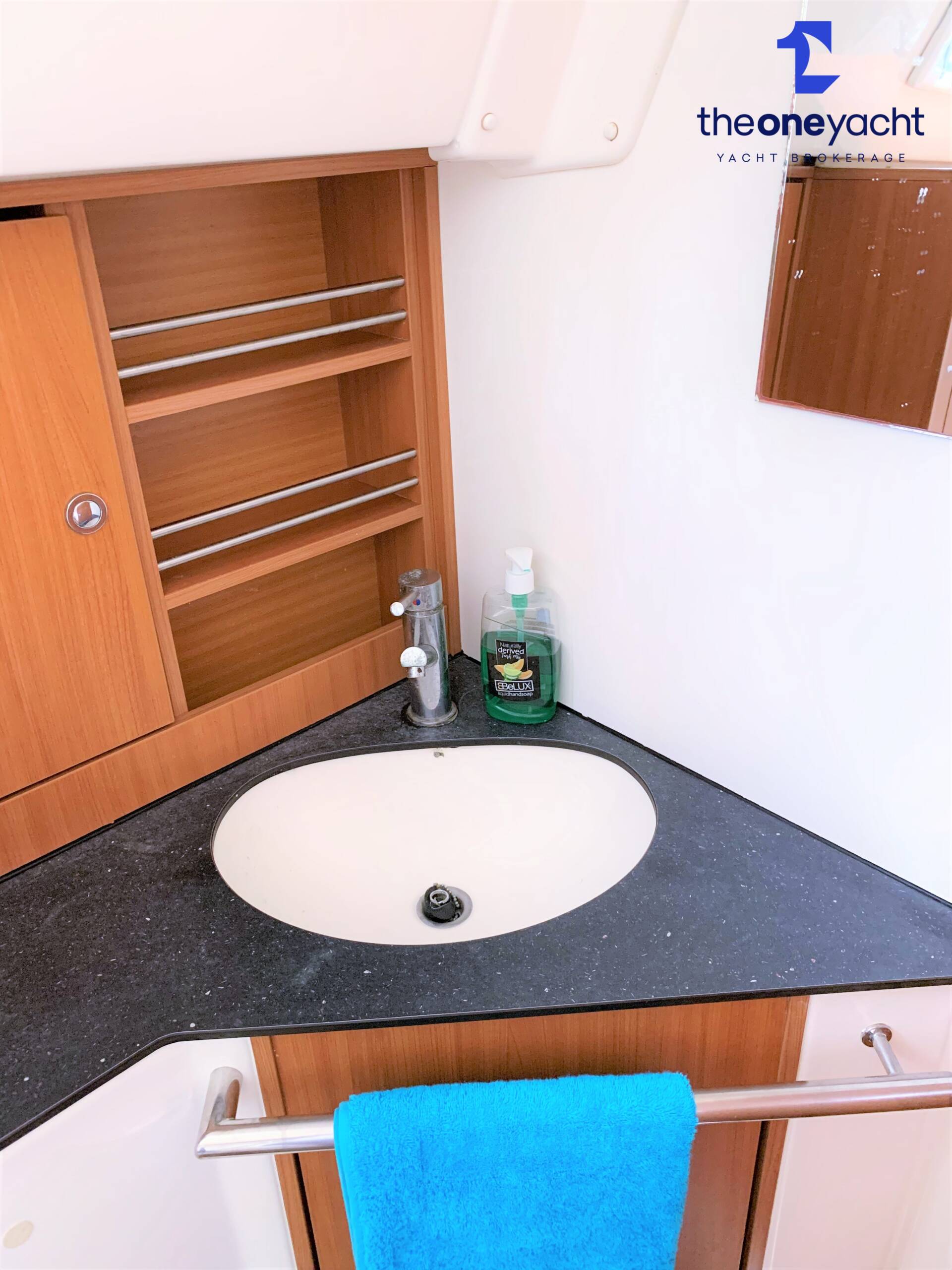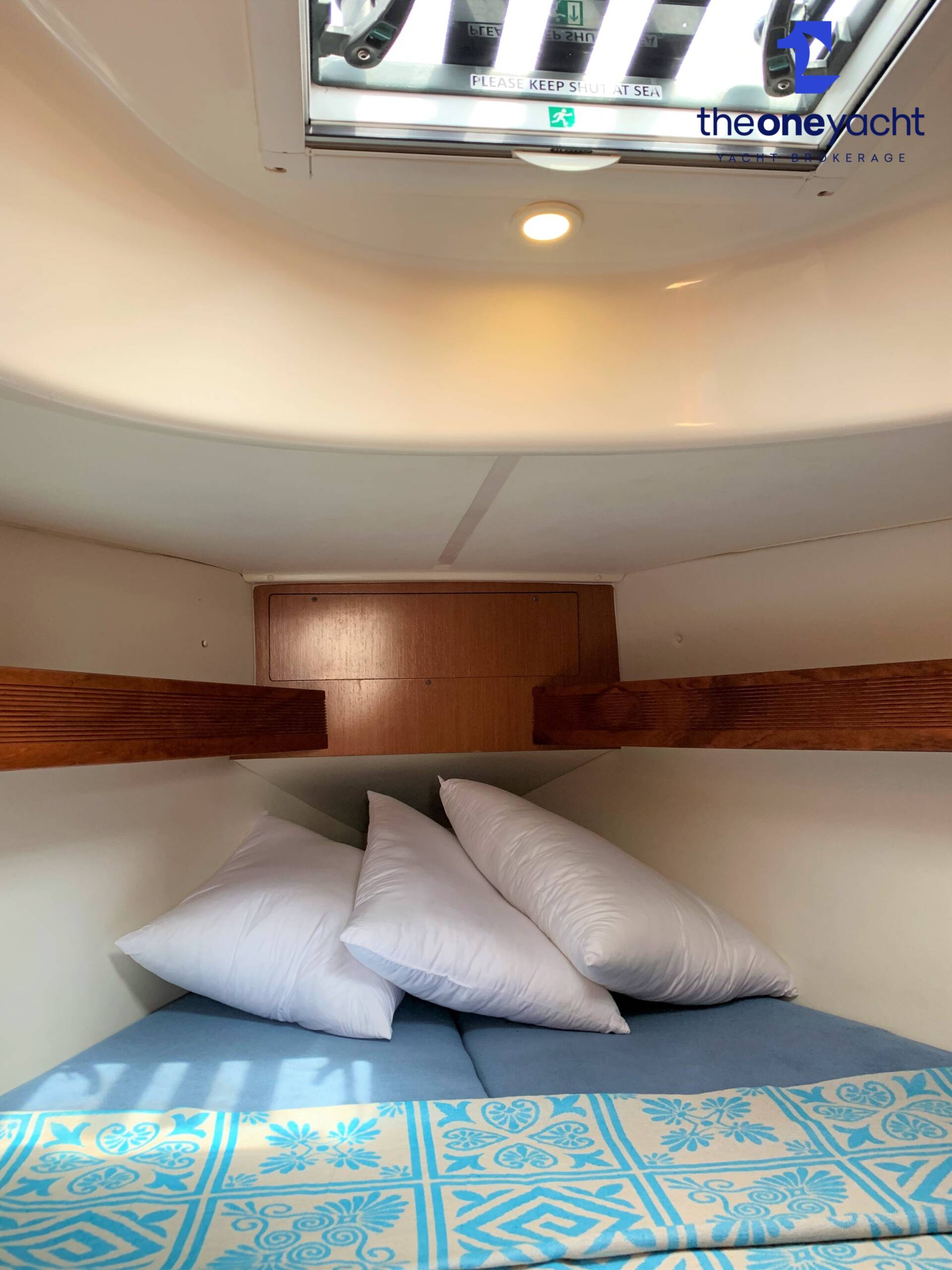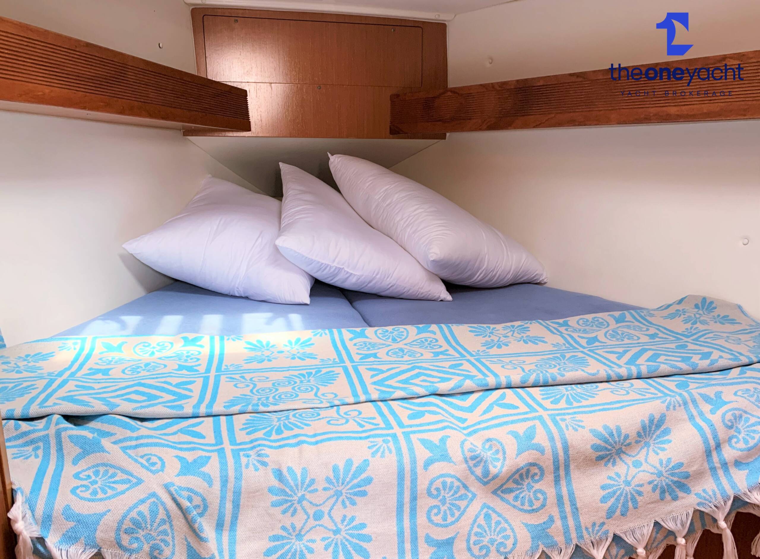 The Bavaria 32 Cruiser offers a cleverly designed and spacious two-cabin layout that makes exceptional use of her sub-10 metre hull length, delivering comfort and practicality far beyond what many yachts in this class provide. Nutmeg features two private double cabins alongside additional saloon berths, comfortably accommodating up to six guests in total. The bright and airy saloon benefits from generous headroom, excellent ventilation, and a warm, welcoming interior finish, creating a comfortable social space for dining or relaxing onboard. A well-appointed galley sits adjacent to the saloon, fitted with practical cooking facilities and storage, while the single heads compartment includes a shower and washbasin for comfortable extended stays aboard. Her smart interior design makes her equally suited to family cruising, couples’ adventures, or liveaboard use during Mediterranean seasons.