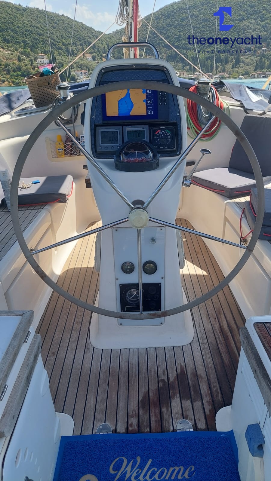 Notable onboard equipment and features include 3 double cabins | 6 berths, 2 heads with electric toilets, 3 showers including transom, Volvo Penta D2-55 engine (annually maintained), In-mast reefing mainsail.