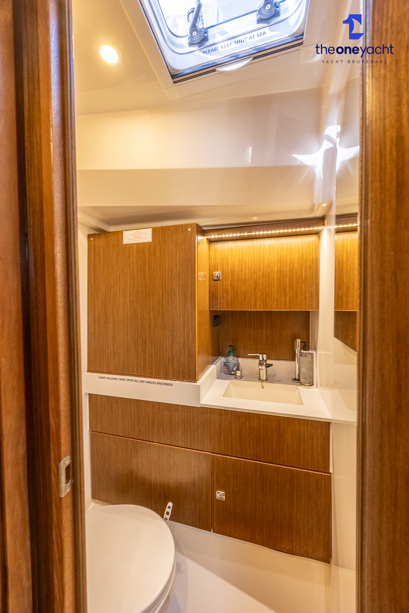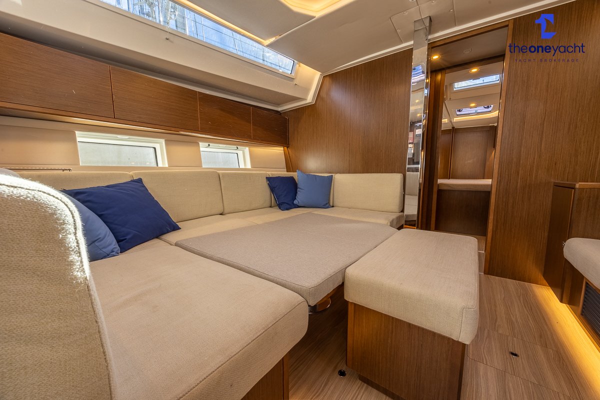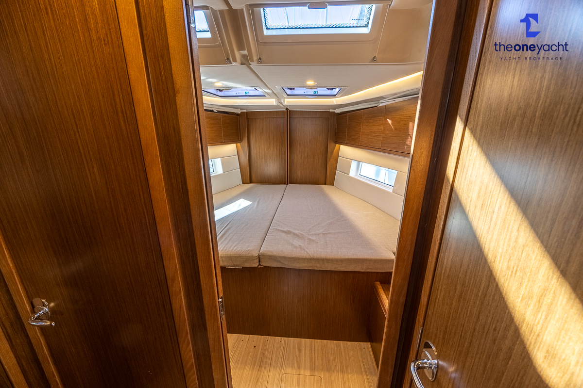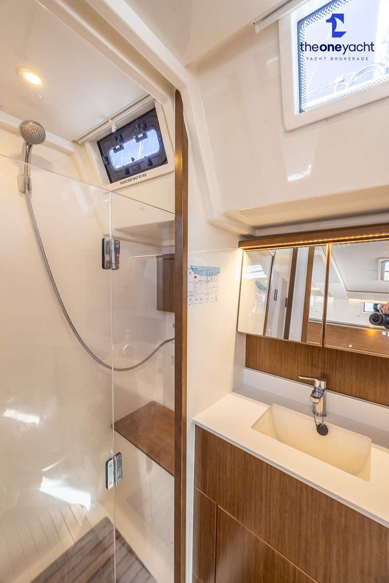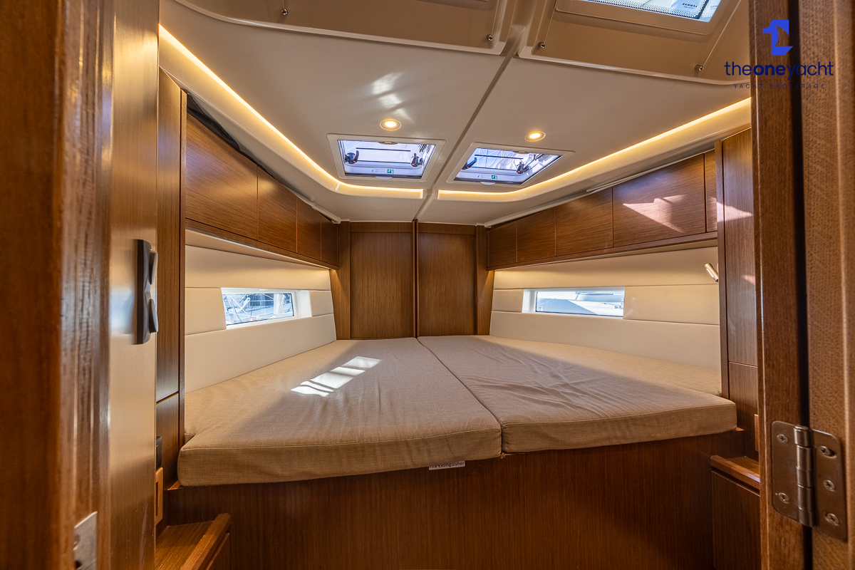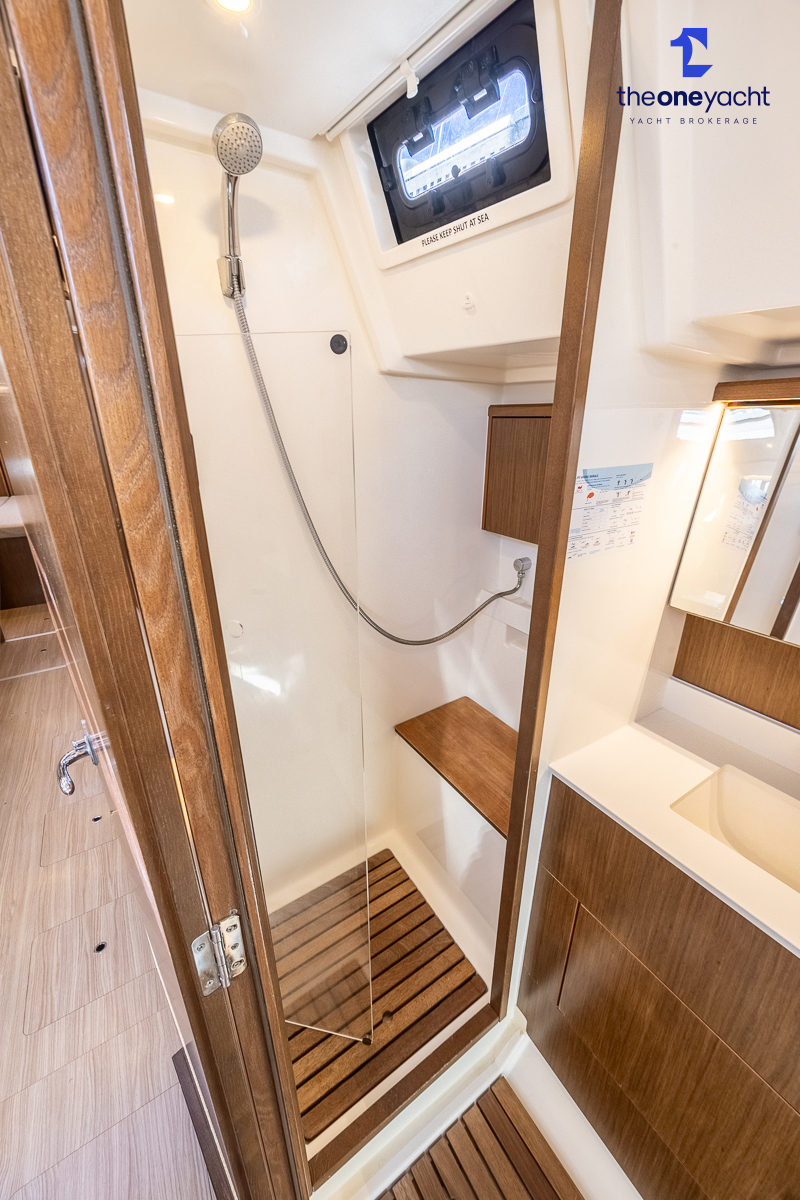 The Bavaria C45 Style offers an exceptionally flexible and luxurious interior layout, designed to maximise both comfort and practicality for extended cruising or entertaining guests onboard. Hummingbird features an innovative 3/4 double cabin arrangement thanks to the desirable forward flex bulkhead cabin system, allowing owners to configure the yacht for either additional sleeping accommodation or expanded owner storage as required. The spacious and beautifully finished walnut interior creates a warm, modern atmosphere throughout, complemented by excellent natural light in the bright open-plan saloon. The electrically convertible saloon table provides an additional double berth, allowing for further guest accommodation when needed. Three heads and three showers, including a dedicated standalone shower enclosure in the starboard aft section, ensure outstanding onboard convenience and privacy, making the C45 one of the most practical yachts in her class for liveaboard use, family cruising, or charter potential.