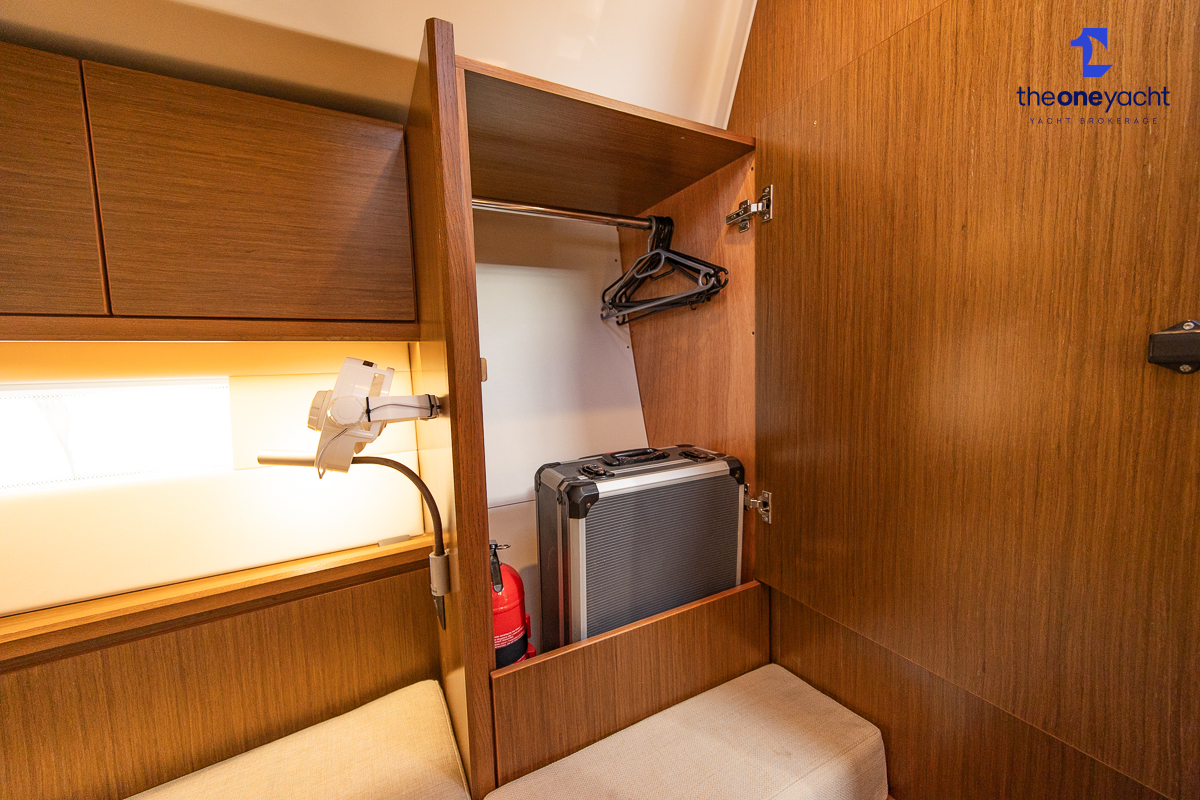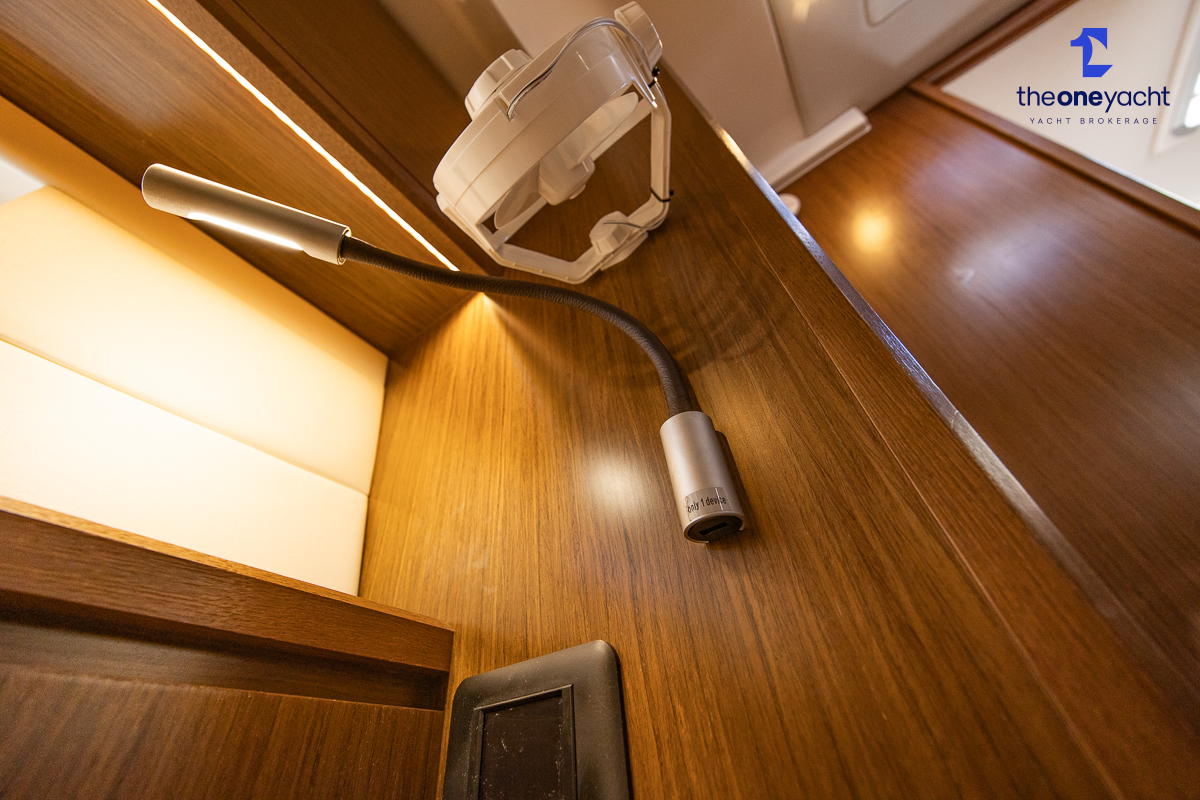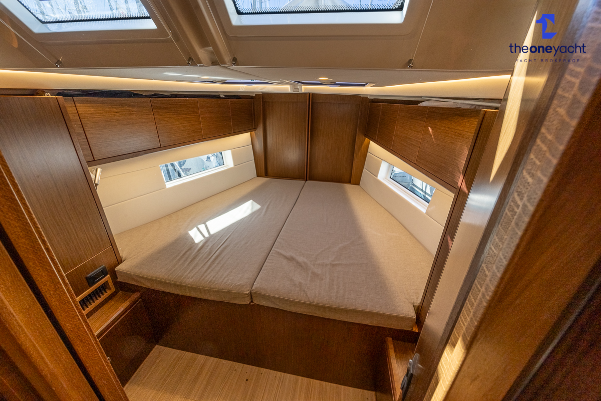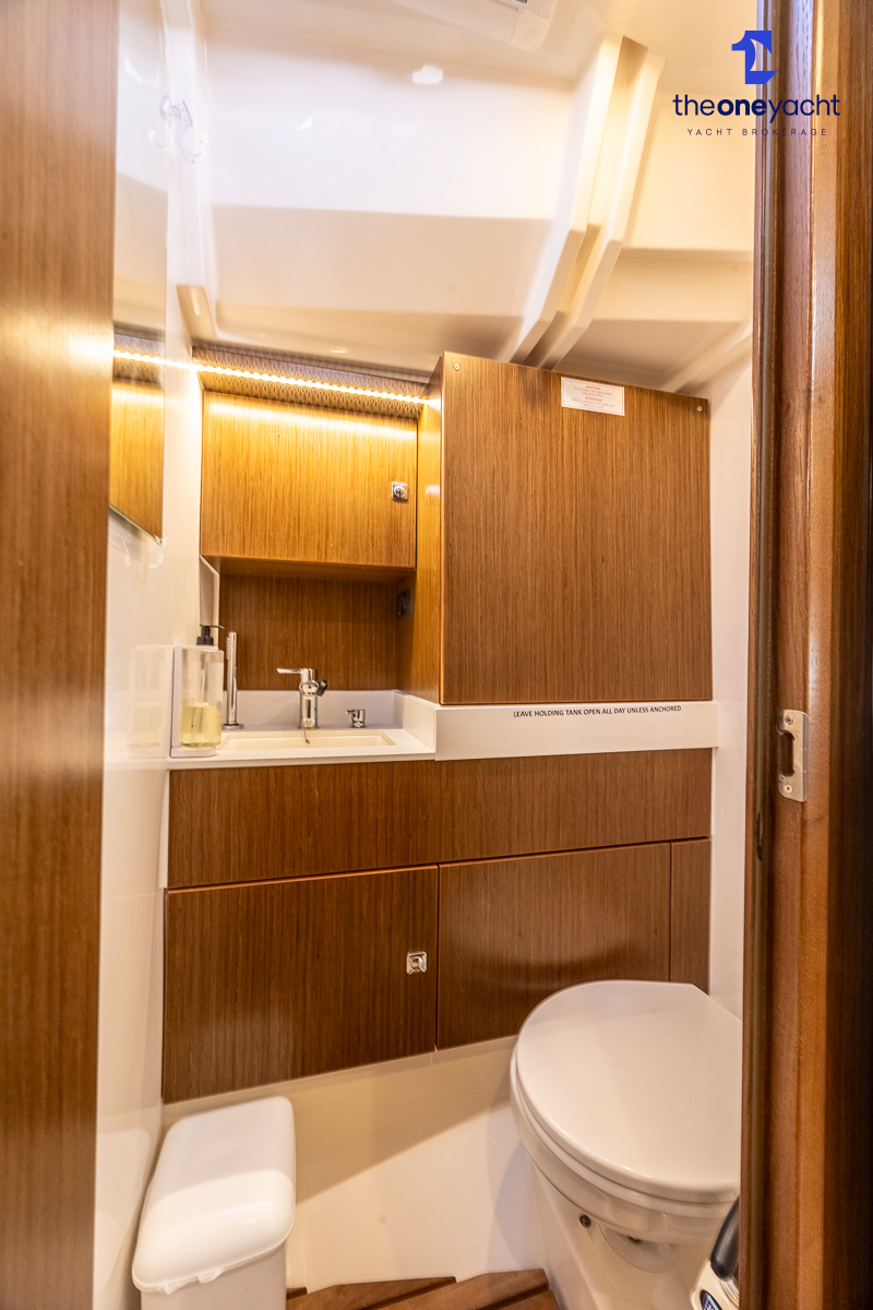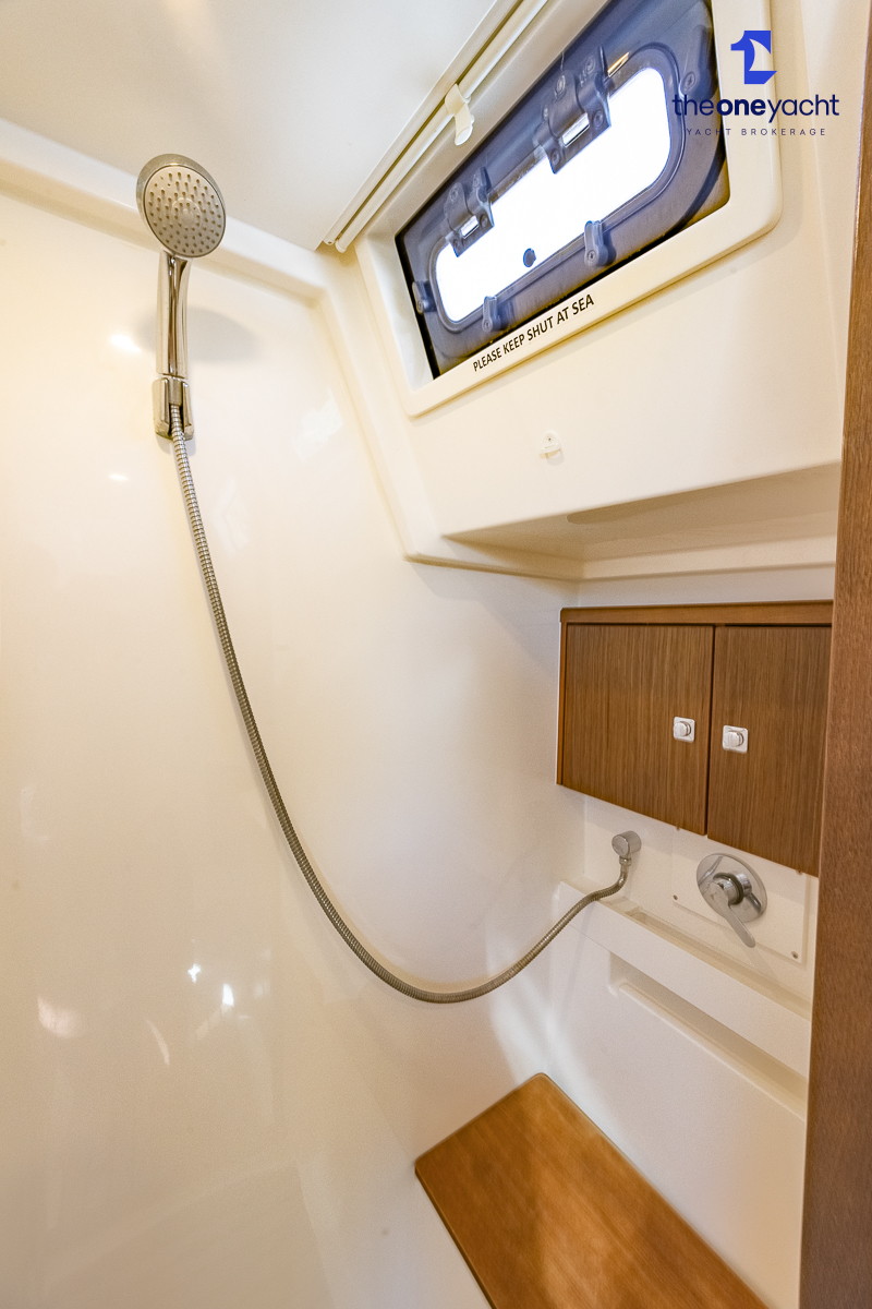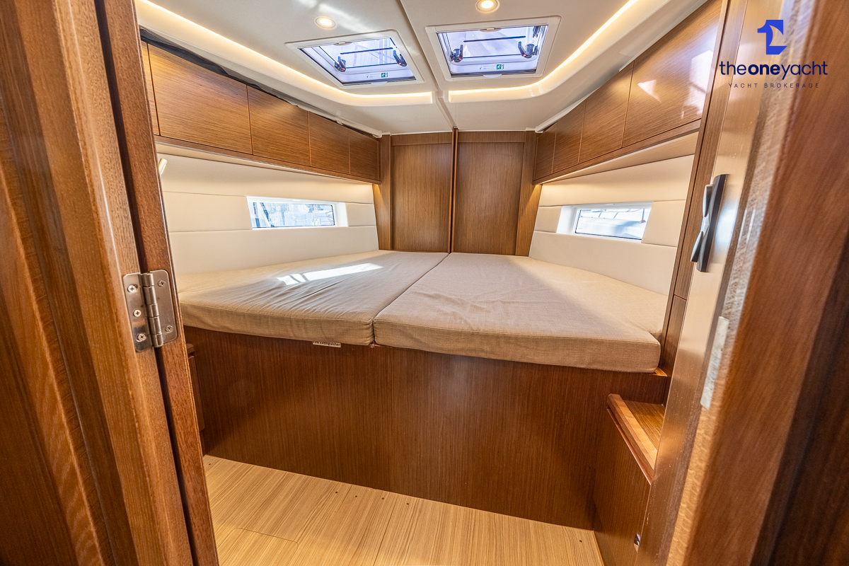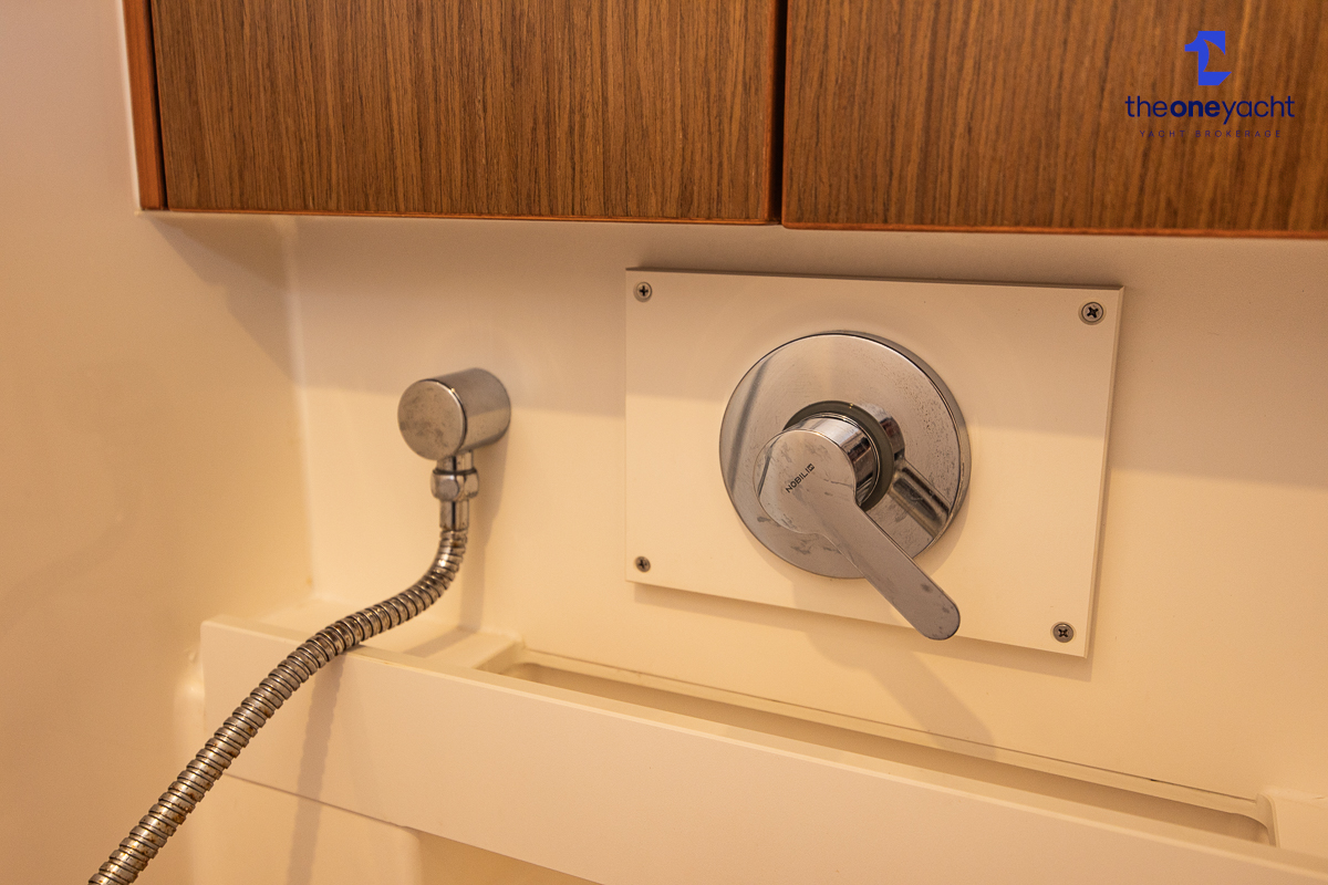 The Bavaria C45 Style offers an exceptionally flexible and luxurious interior layout, designed to maximise both comfort and practicality for extended cruising or entertaining guests onboard. Hummingbird features an innovative 3/4 double cabin arrangement thanks to the desirable forward flex bulkhead cabin system, allowing owners to configure the yacht for either additional sleeping accommodation or expanded owner storage as required. The spacious and beautifully finished walnut interior creates a warm, modern atmosphere throughout, complemented by excellent natural light in the bright open-plan saloon. The electrically convertible saloon table provides an additional double berth, allowing for further guest accommodation when needed. Three heads and three showers, including a dedicated standalone shower enclosure in the starboard aft section, ensure outstanding onboard convenience and privacy, making the C45 one of the most practical yachts in her class for liveaboard use, family cruising, or charter potential.
