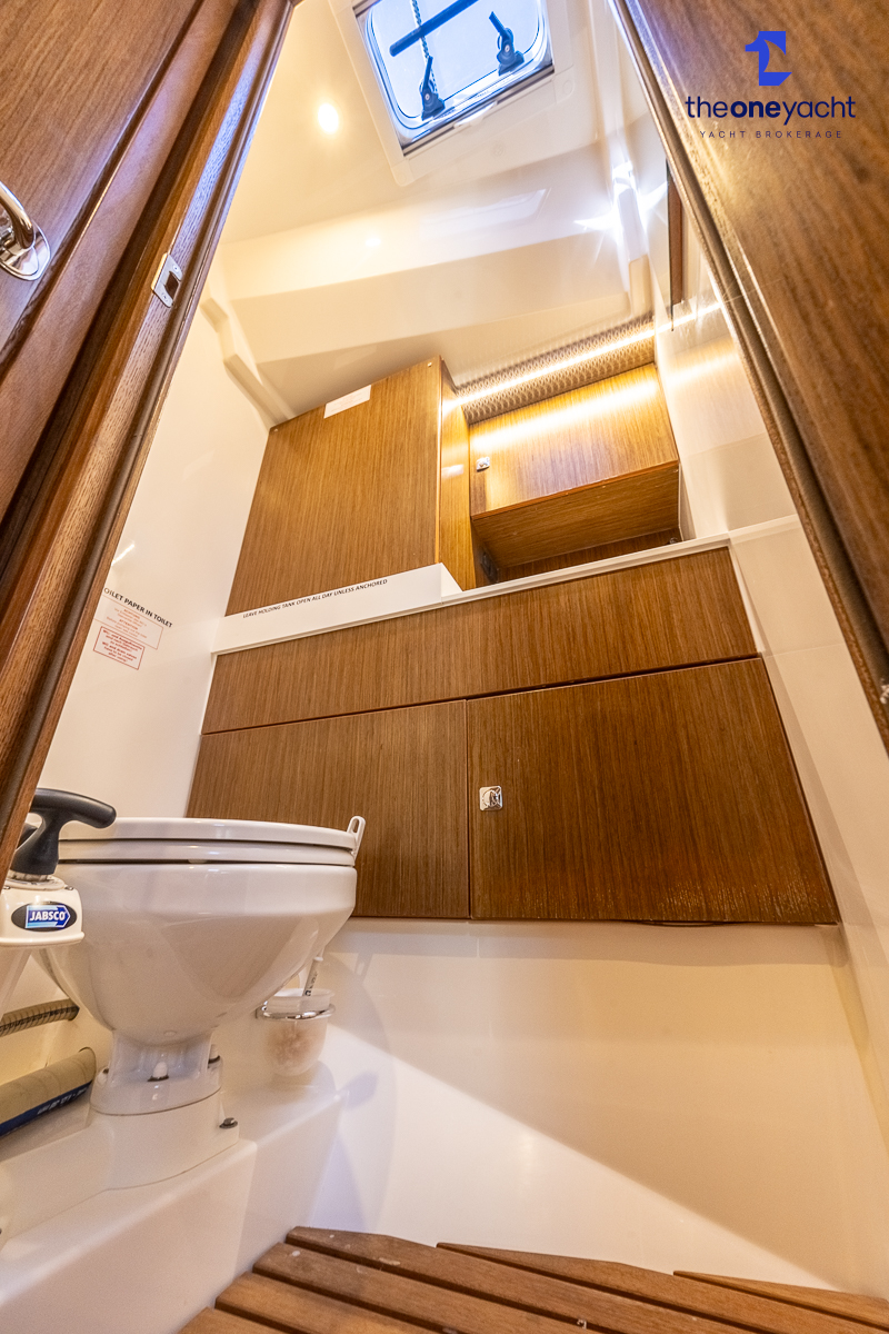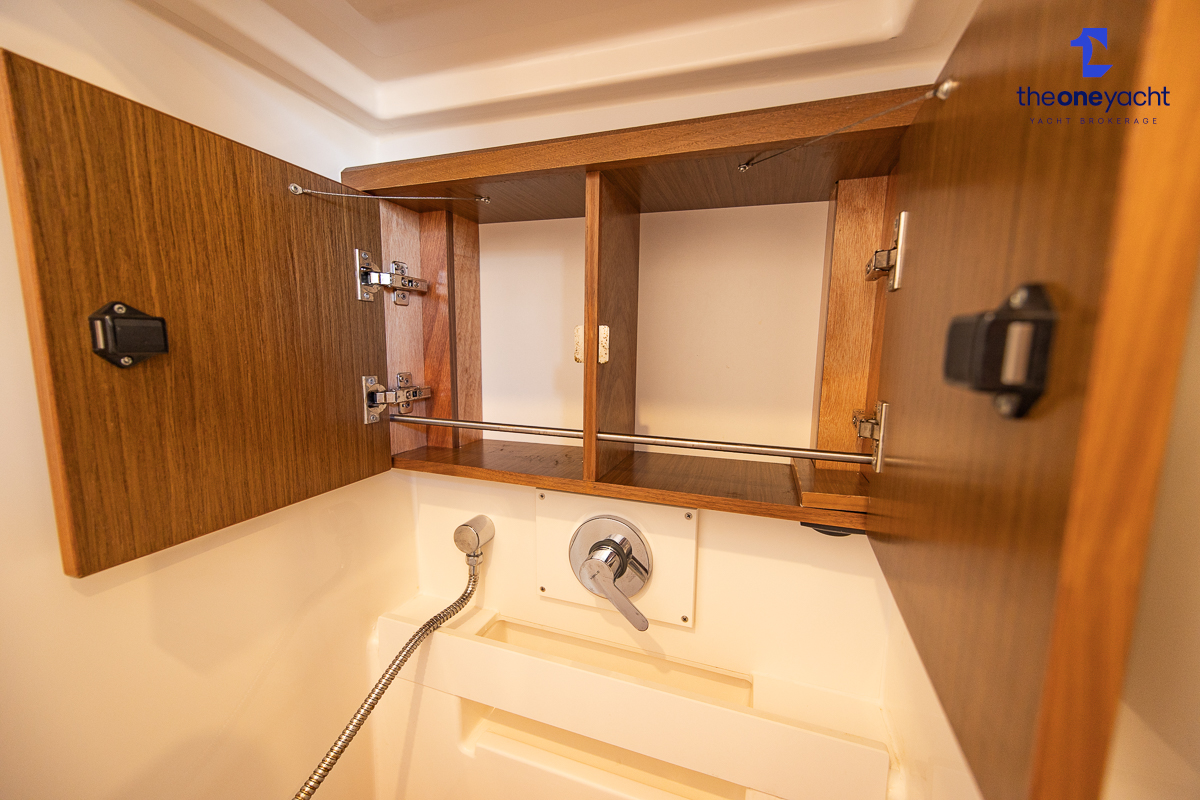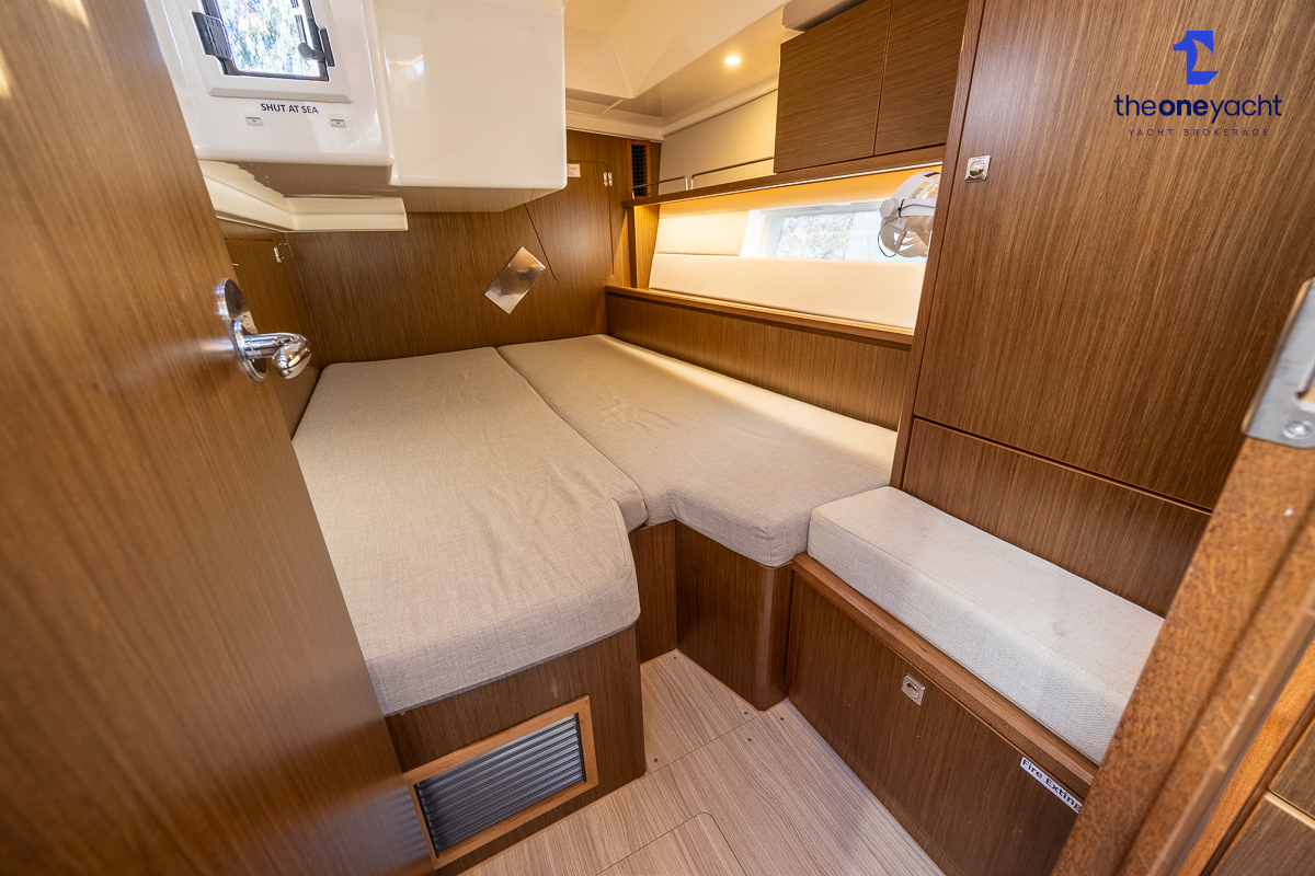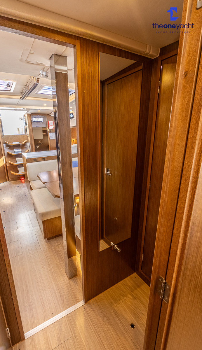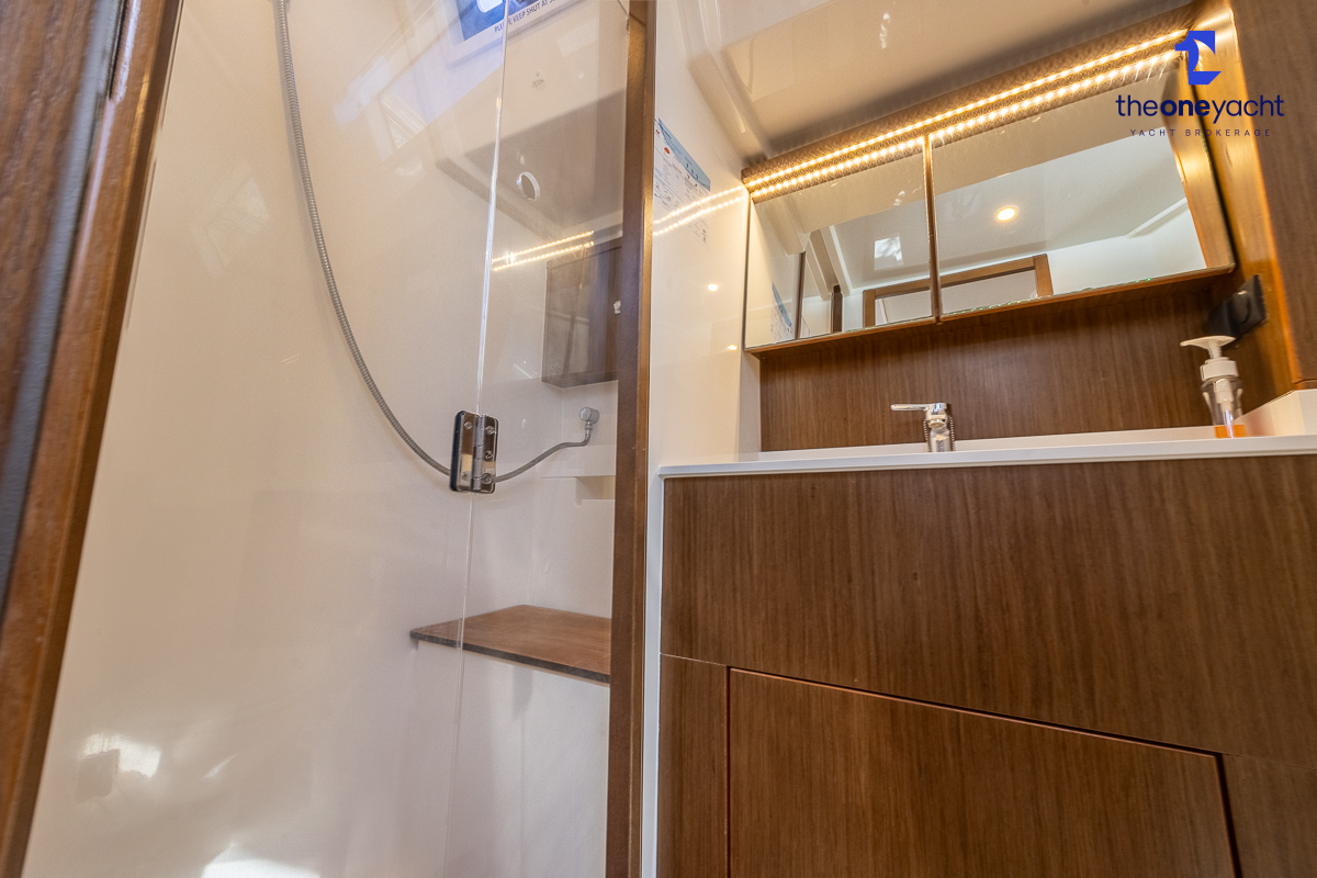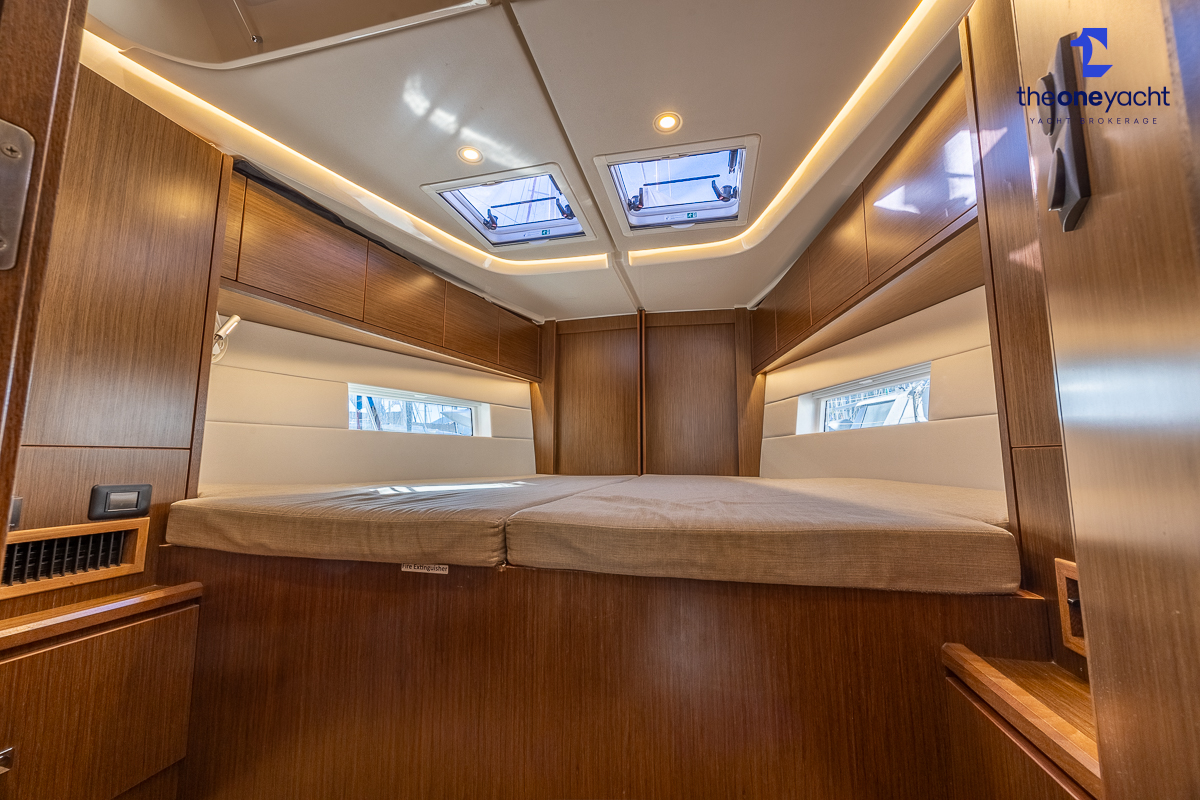 The Bavaria C45 Style offers an exceptionally flexible and luxurious interior layout, designed to maximise both comfort and practicality for extended cruising or entertaining guests onboard. Hummingbird features an innovative 3/4 double cabin arrangement thanks to the desirable forward flex bulkhead cabin system, allowing owners to configure the yacht for either additional sleeping accommodation or expanded owner storage as required. The spacious and beautifully finished walnut interior creates a warm, modern atmosphere throughout, complemented by excellent natural light in the bright open-plan saloon. The electrically convertible saloon table provides an additional double berth, allowing for further guest accommodation when needed. Three heads and three showers, including a dedicated standalone shower enclosure in the starboard aft section, ensure outstanding onboard convenience and privacy, making the C45 one of the most practical yachts in her class for liveaboard use, family cruising, or charter potential.