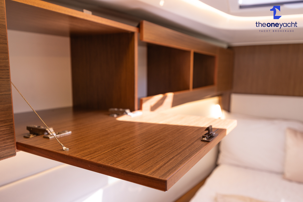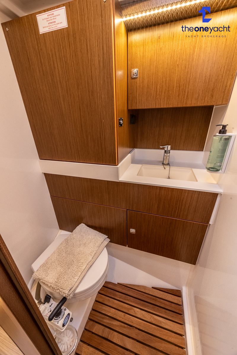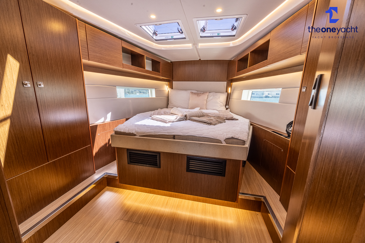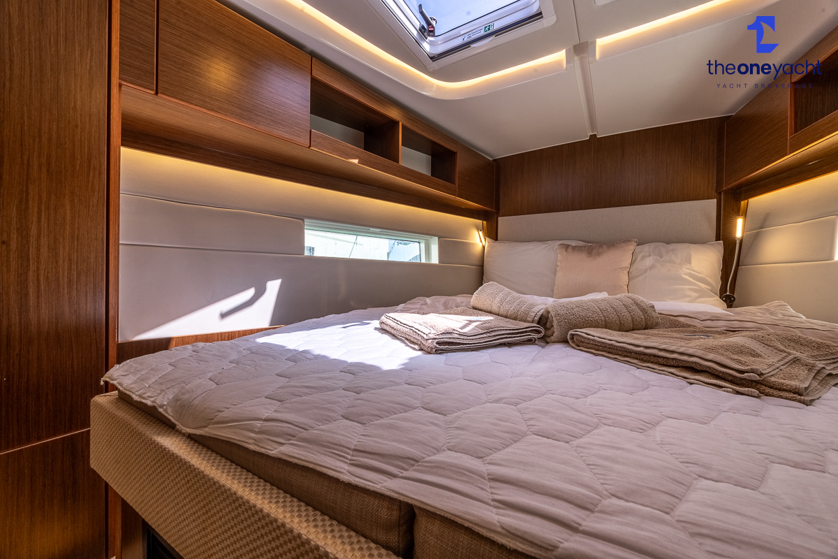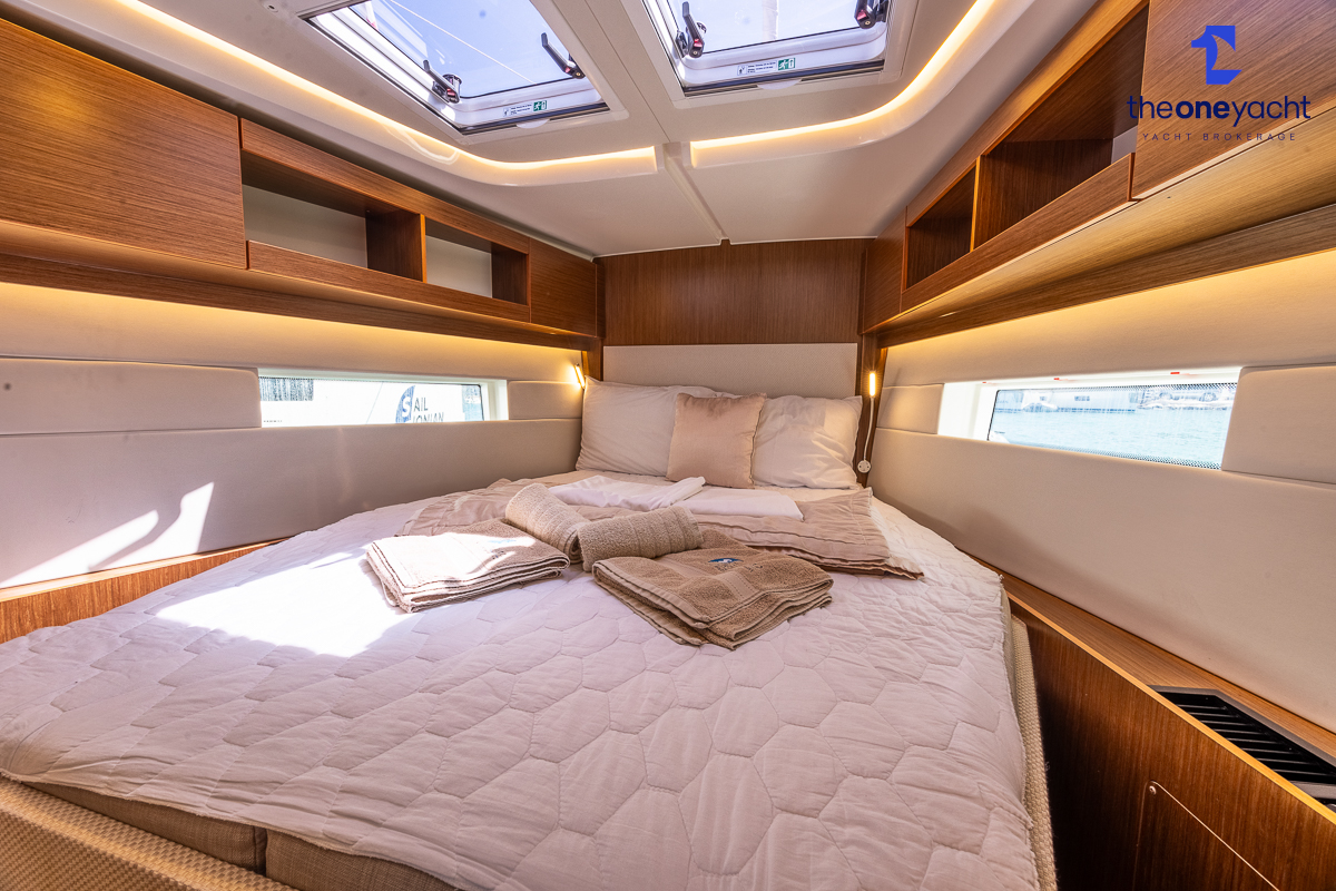 Scugnizzo offers a bright, spacious, and highly versatile layout designed for luxurious cruising and entertaining. She features three generous double cabins complemented by an electric convertible saloon table that creates an additional double berth when required, comfortably accommodating family and guests. Two well-appointed heads and showers, including a dedicated standalone shower enclosure in the aft starboard heads, provide practicality and privacy for longer stays aboard. Her elegant walnut interior and elm flooring create a refined modern atmosphere, while the bright open-plan saloon offers abundant seating, natural light, and seamless access to a fully equipped galley finished with premium solid worktops. On deck, the expansive cockpit and integrated wet bar provide exceptional outdoor entertaining space, enhanced further by the rare dinghy garage and oversized bathing platform.