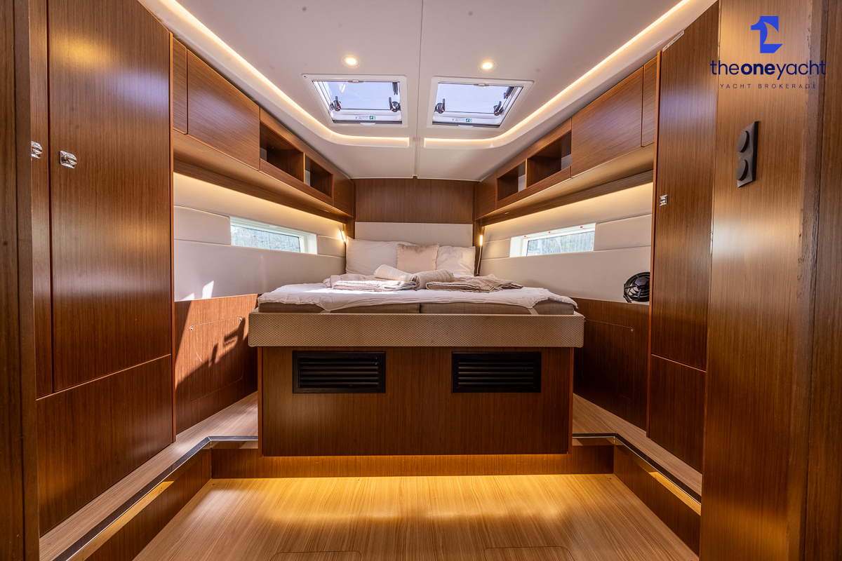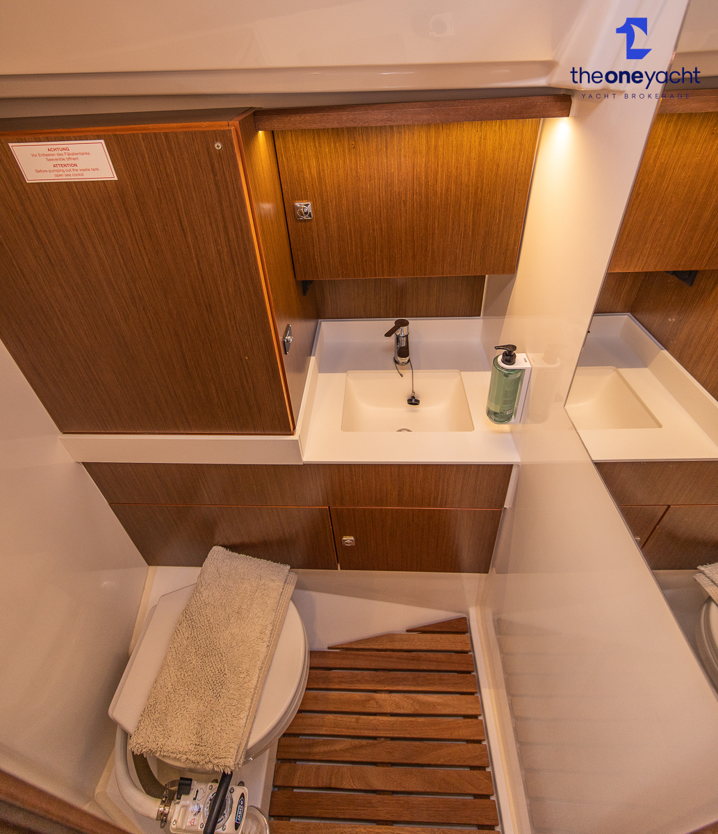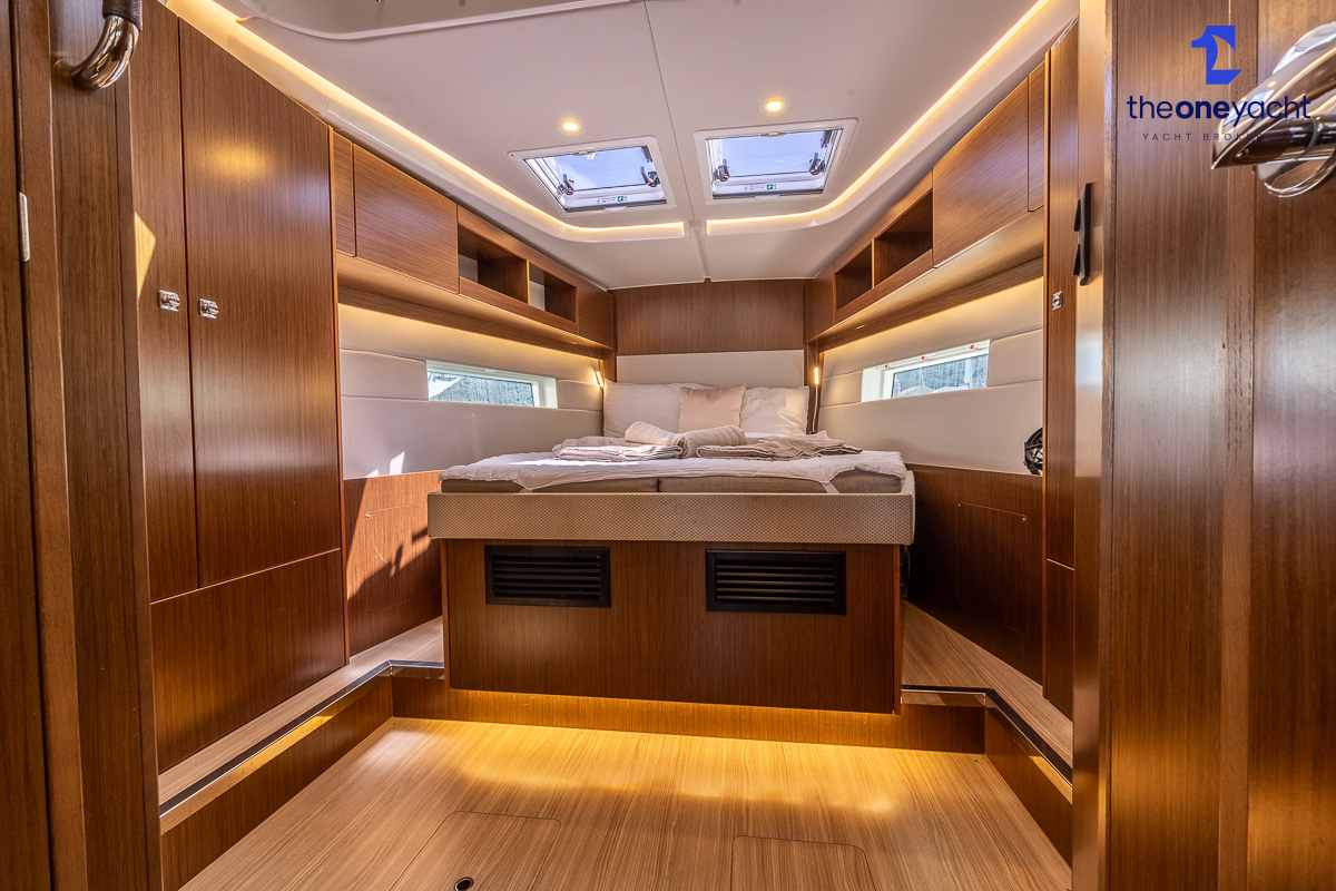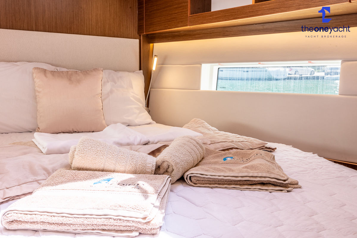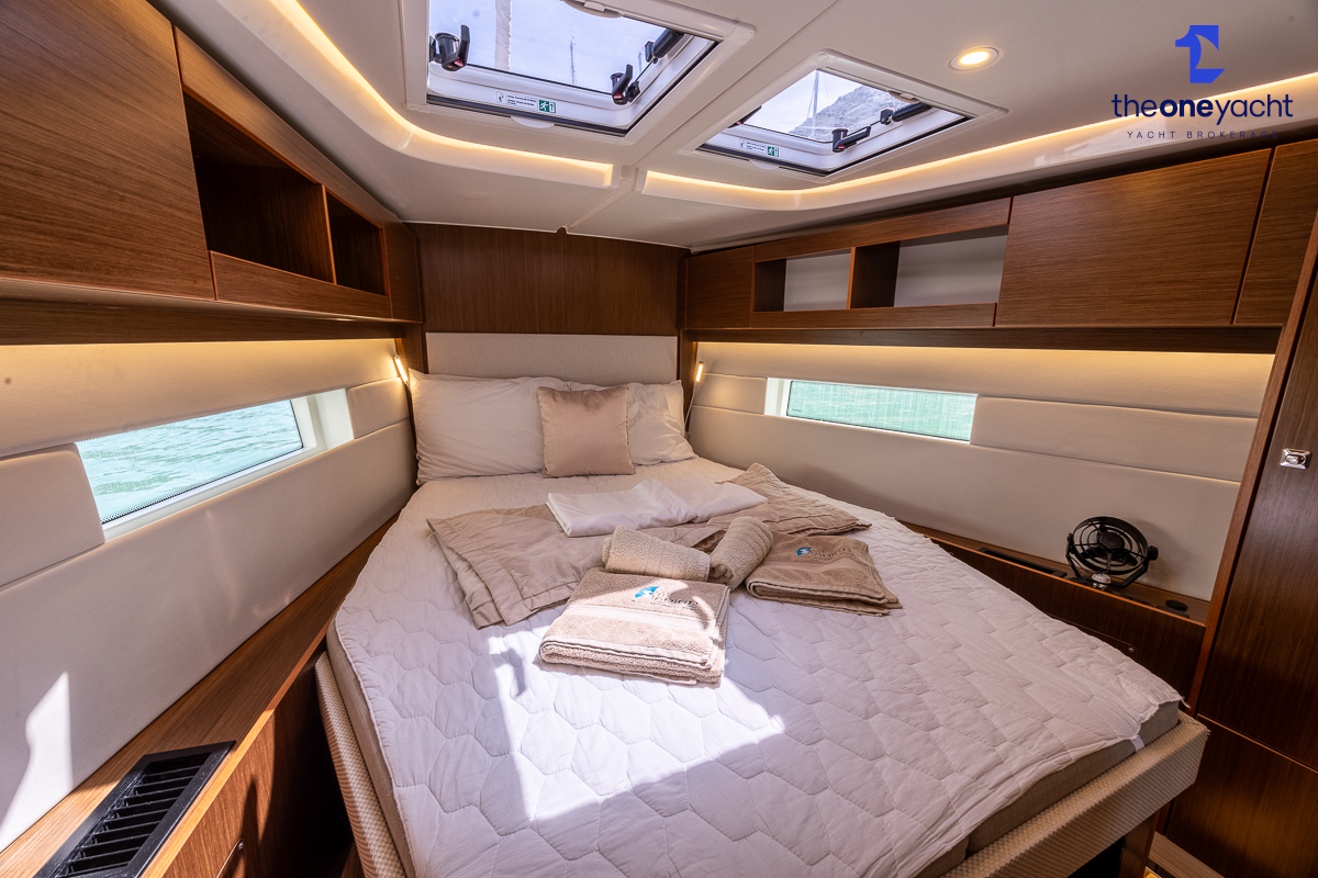 Scugnizzo offers a bright, spacious, and highly versatile layout designed for luxurious cruising and entertaining. She features three generous double cabins complemented by an electric convertible saloon table that creates an additional double berth when required, comfortably accommodating family and guests. Two well-appointed heads and showers, including a dedicated standalone shower enclosure in the aft starboard heads, provide practicality and privacy for longer stays aboard. Her elegant walnut interior and elm flooring create a refined modern atmosphere, while the bright open-plan saloon offers abundant seating, natural light, and seamless access to a fully equipped galley finished with premium solid worktops. On deck, the expansive cockpit and integrated wet bar provide exceptional outdoor entertaining space, enhanced further by the rare dinghy garage and oversized bathing platform.