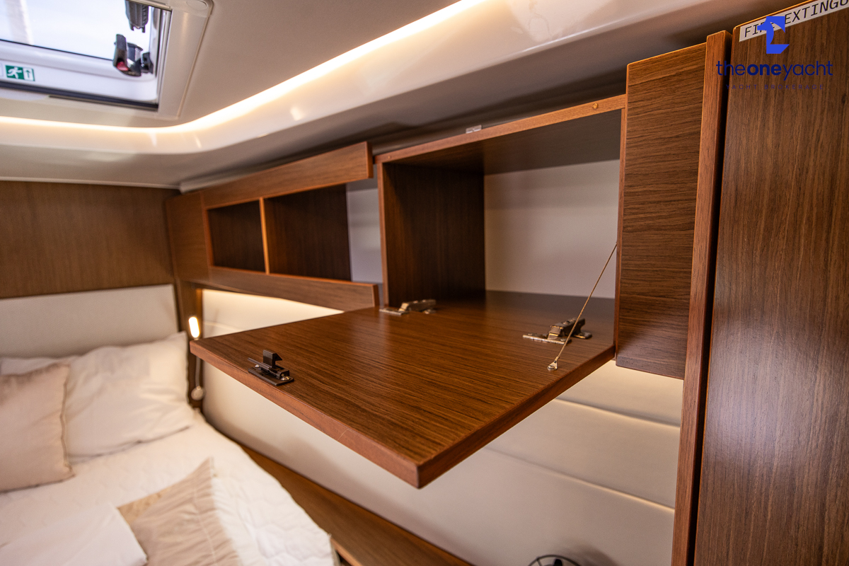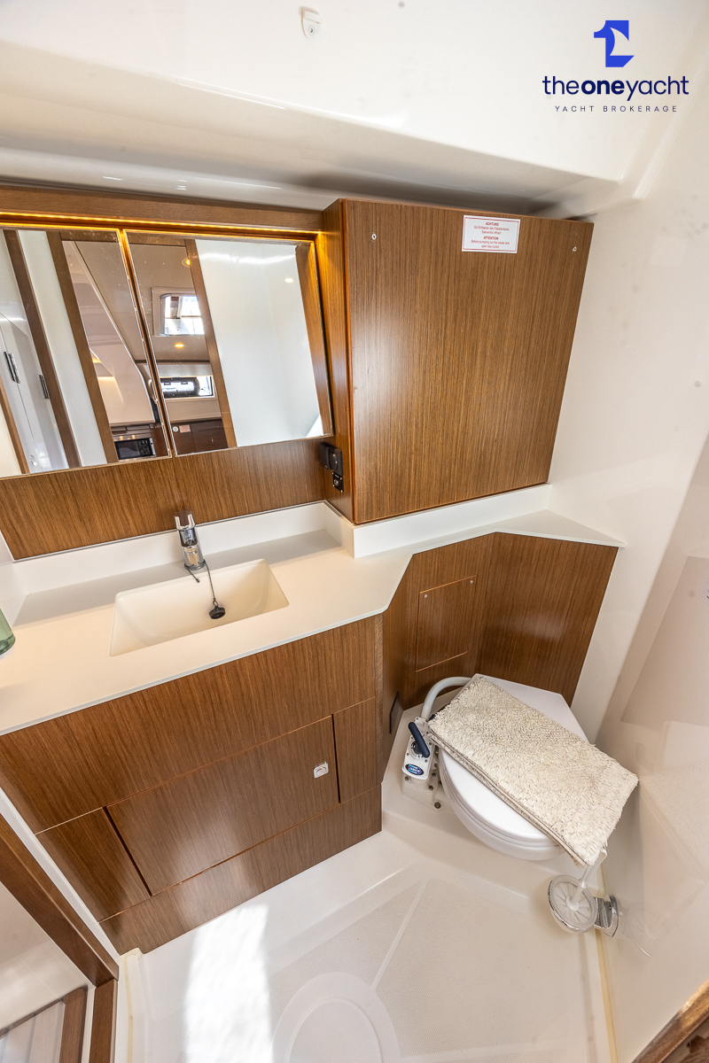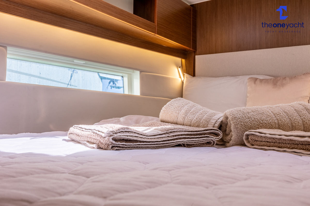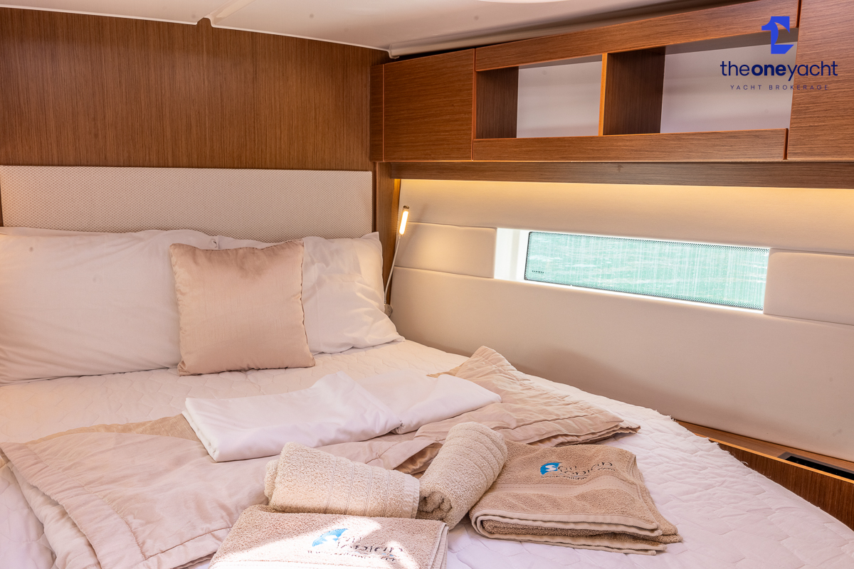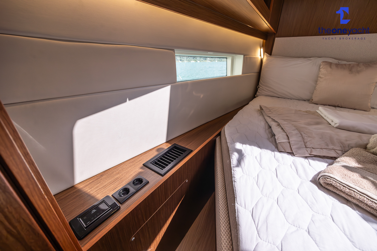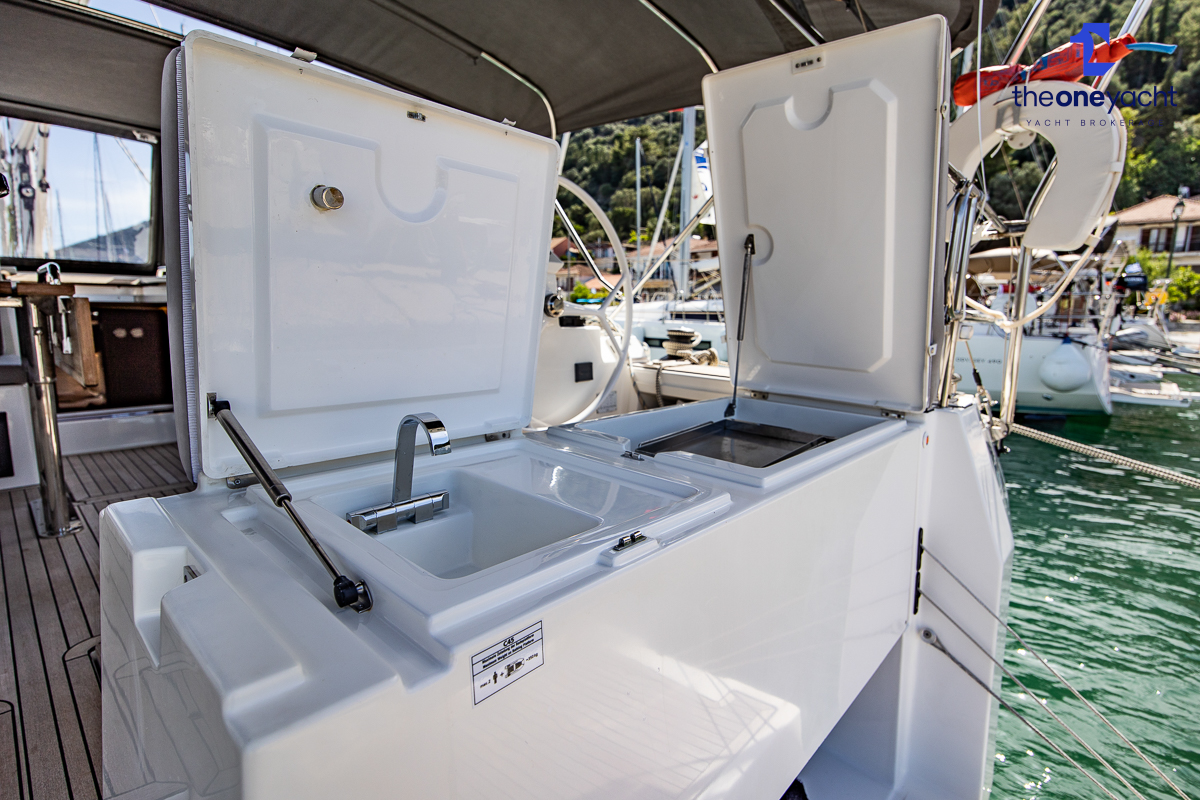 Scugnizzo offers a bright, spacious, and highly versatile layout designed for luxurious cruising and entertaining. She features three generous double cabins complemented by an electric convertible saloon table that creates an additional double berth when required, comfortably accommodating family and guests. Two well-appointed heads and showers, including a dedicated standalone shower enclosure in the aft starboard heads, provide practicality and privacy for longer stays aboard. Her elegant walnut interior and elm flooring create a refined modern atmosphere, while the bright open-plan saloon offers abundant seating, natural light, and seamless access to a fully equipped galley finished with premium solid worktops. On deck, the expansive cockpit and integrated wet bar provide exceptional outdoor entertaining space, enhanced further by the rare dinghy garage and oversized bathing platform.