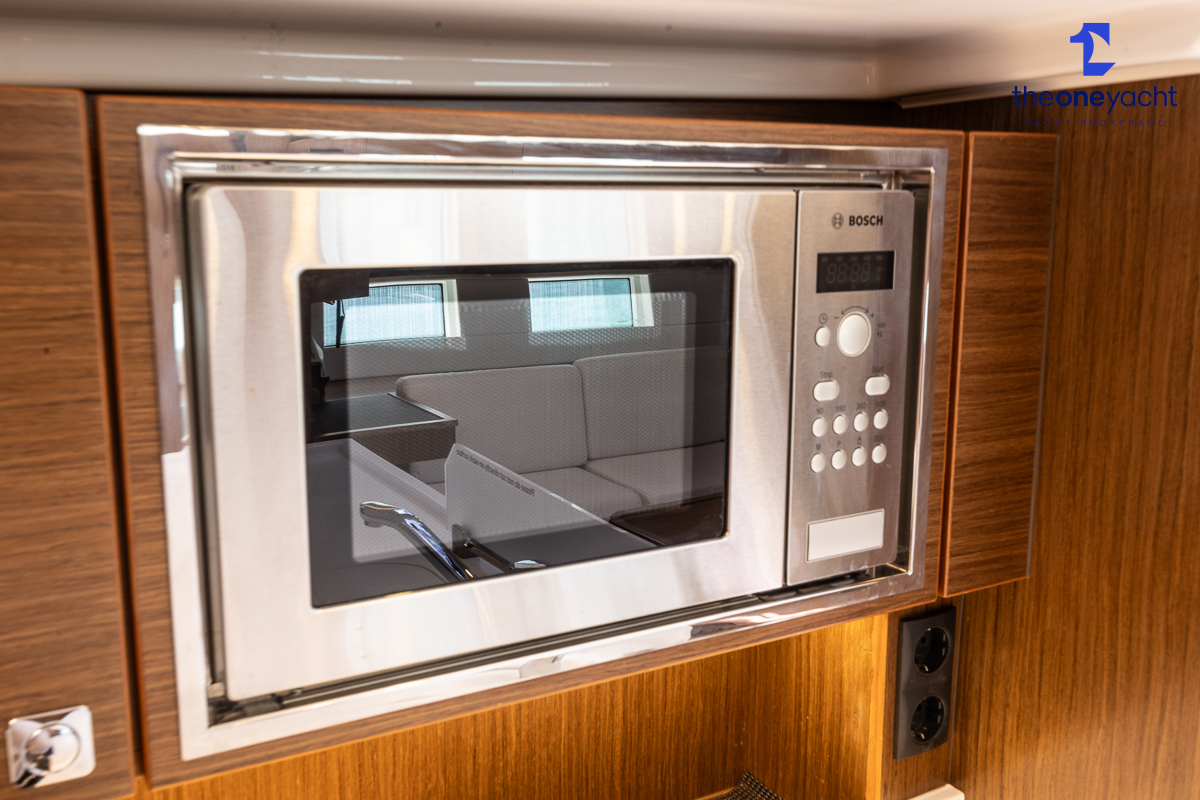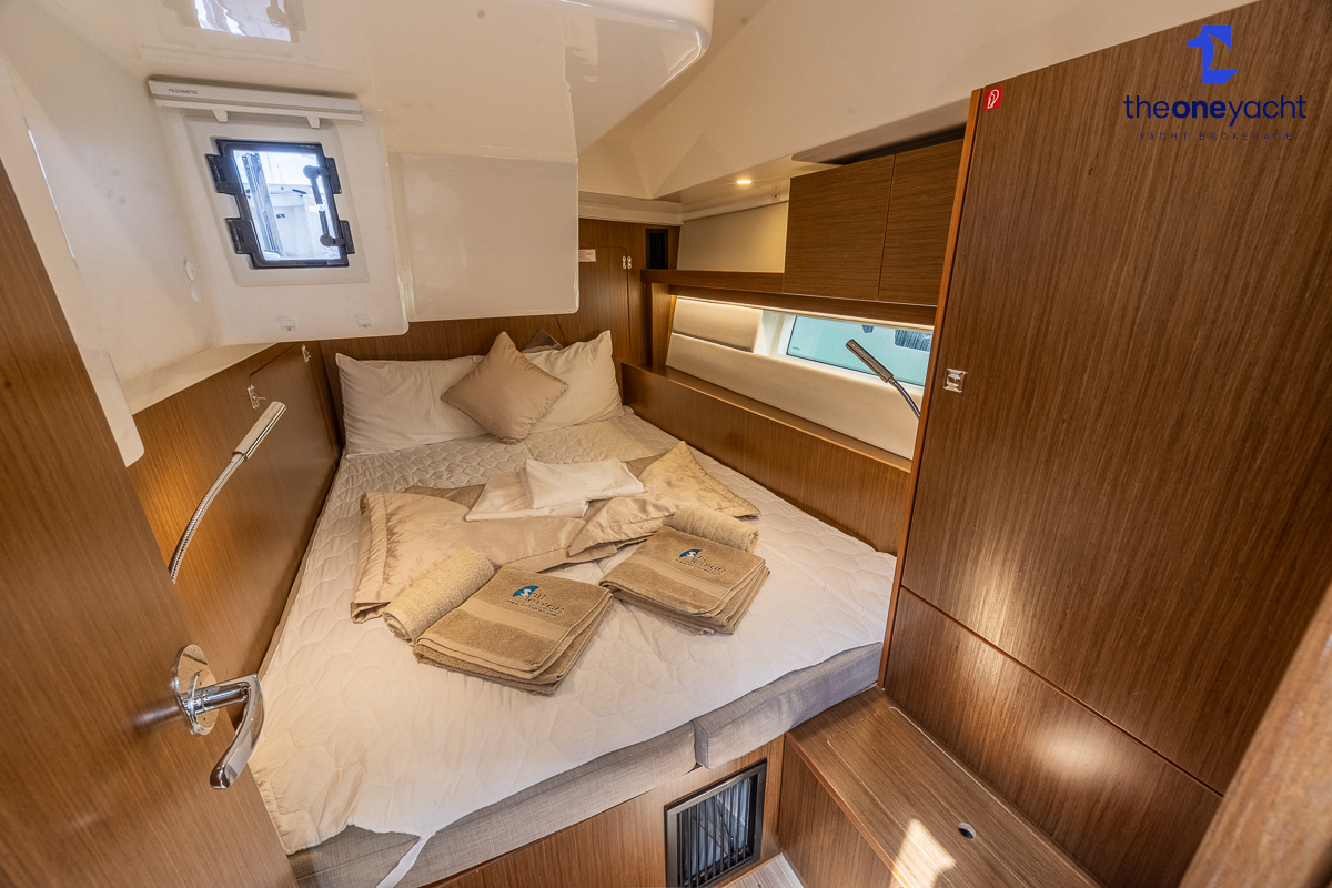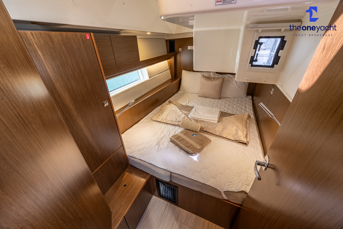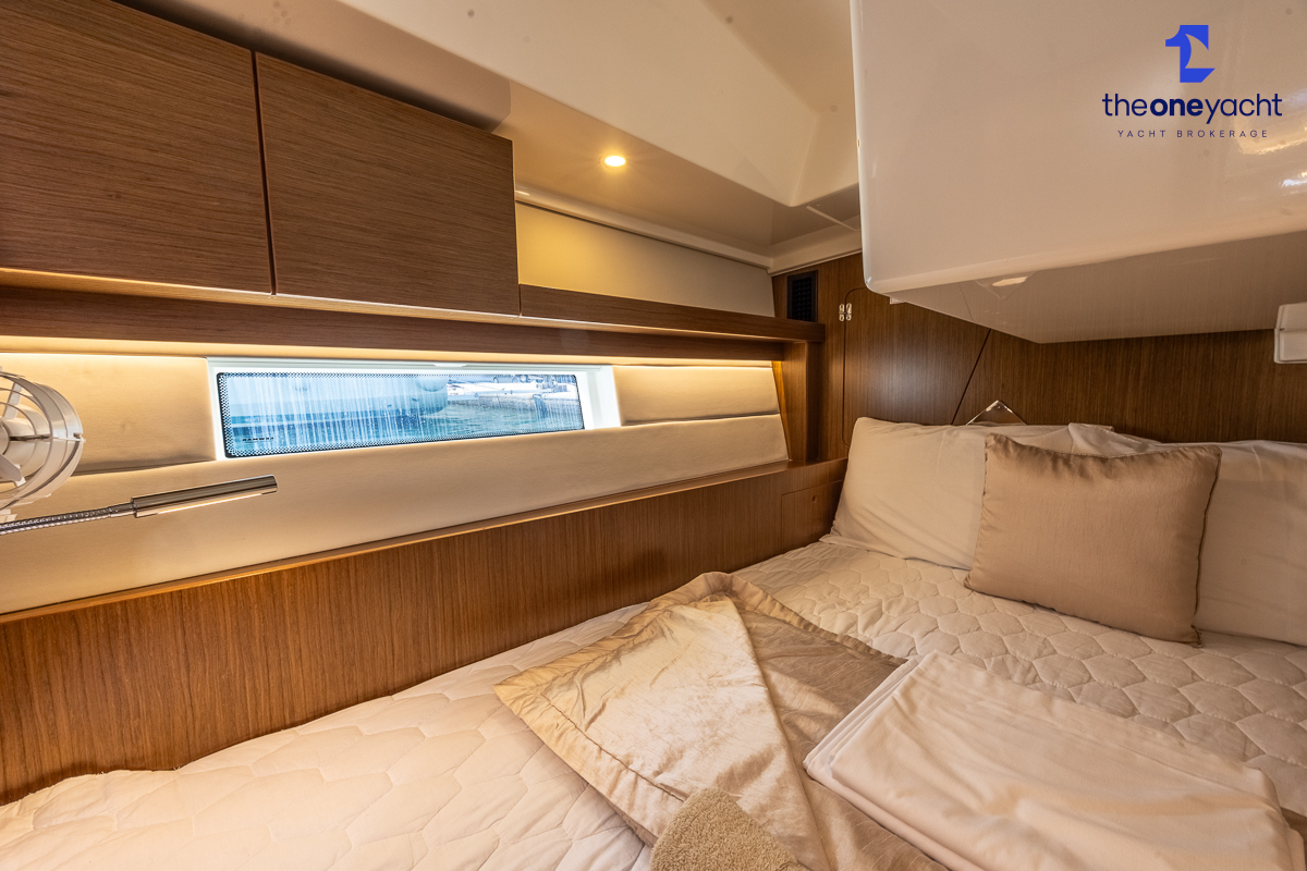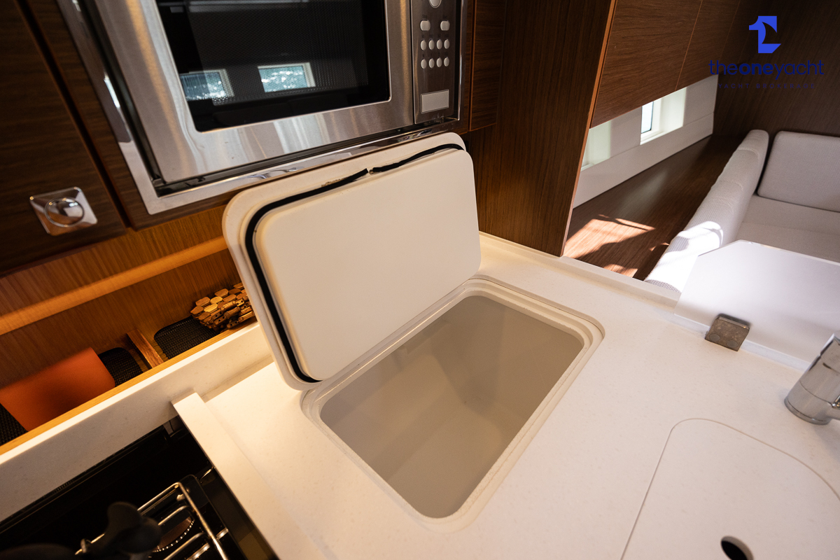 Scugnizzo offers a bright, spacious, and highly versatile layout designed for luxurious cruising and entertaining. She features three generous double cabins complemented by an electric convertible saloon table that creates an additional double berth when required, comfortably accommodating family and guests. Two well-appointed heads and showers, including a dedicated standalone shower enclosure in the aft starboard heads, provide practicality and privacy for longer stays aboard. Her elegant walnut interior and elm flooring create a refined modern atmosphere, while the bright open-plan saloon offers abundant seating, natural light, and seamless access to a fully equipped galley finished with premium solid worktops. On deck, the expansive cockpit and integrated wet bar provide exceptional outdoor entertaining space, enhanced further by the rare dinghy garage and oversized bathing platform.