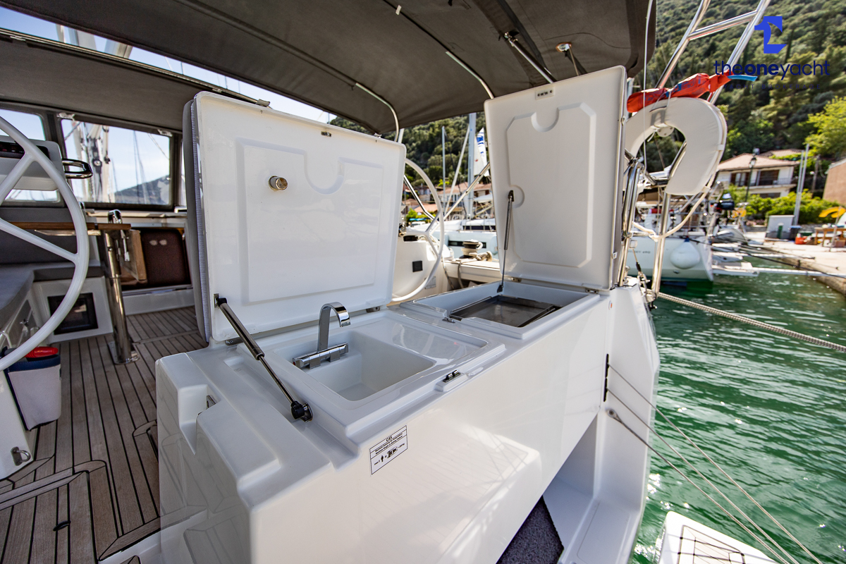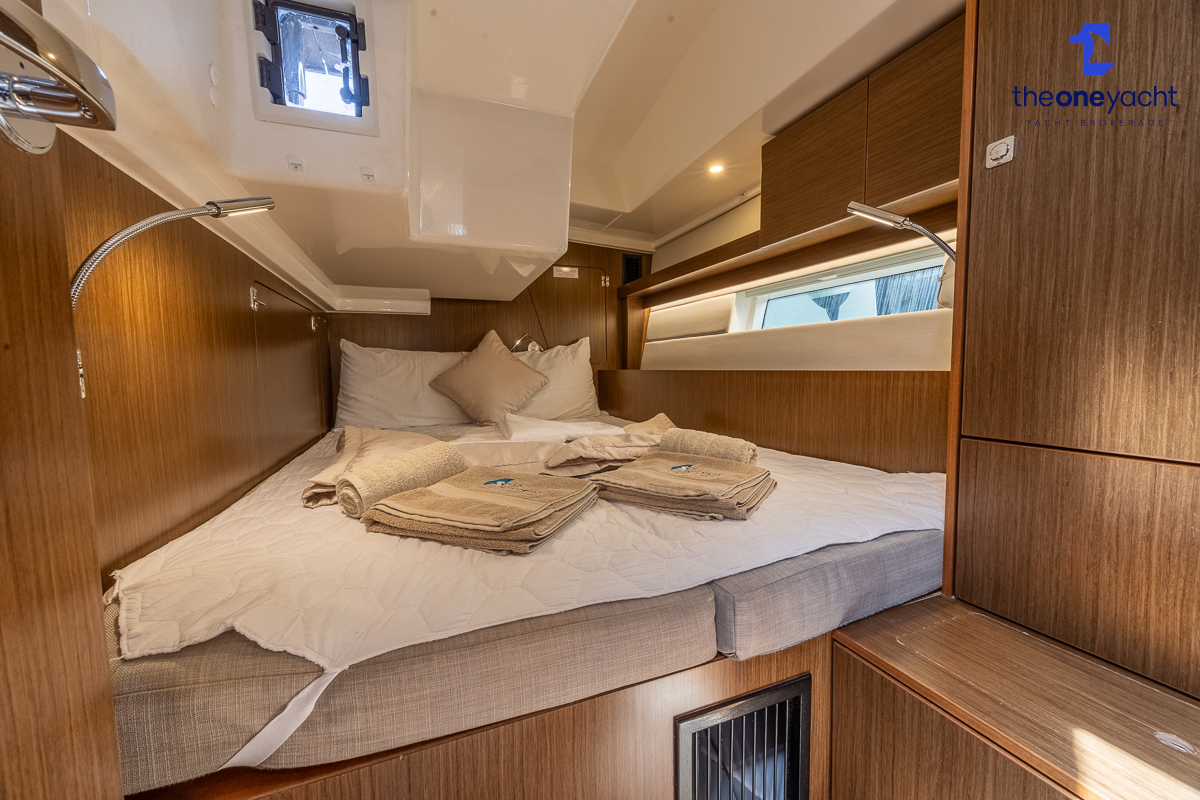 This Bavaria C45 – ‘Scugnizzo’ will make you feel completely at home whilst onboard – with features like the huge bathing platform, big cockpit and bright saloon. In other words it is a yacht of the utmost flexibility. In addition, this is the only yacht in its class available which has a dinghy garage for a tender! As a result the Bavaria C45 is a masterpiece in design, engineering and technology. For instance this range was designed for sailors who place high expectations on their yacht. Above all the fast and reliable sailing performance is impressive and can be easily handled by a small crew, or similarly enjoyed by a group of friends! Configured with 3 cabins, 2 heads, 14.43 m.