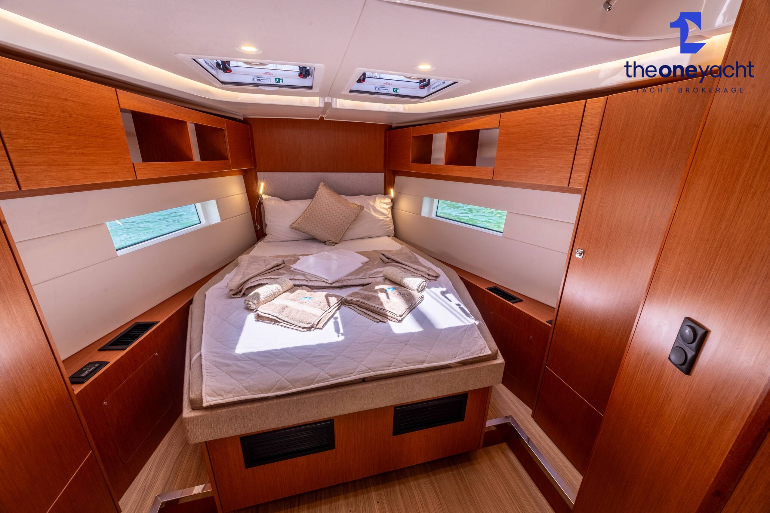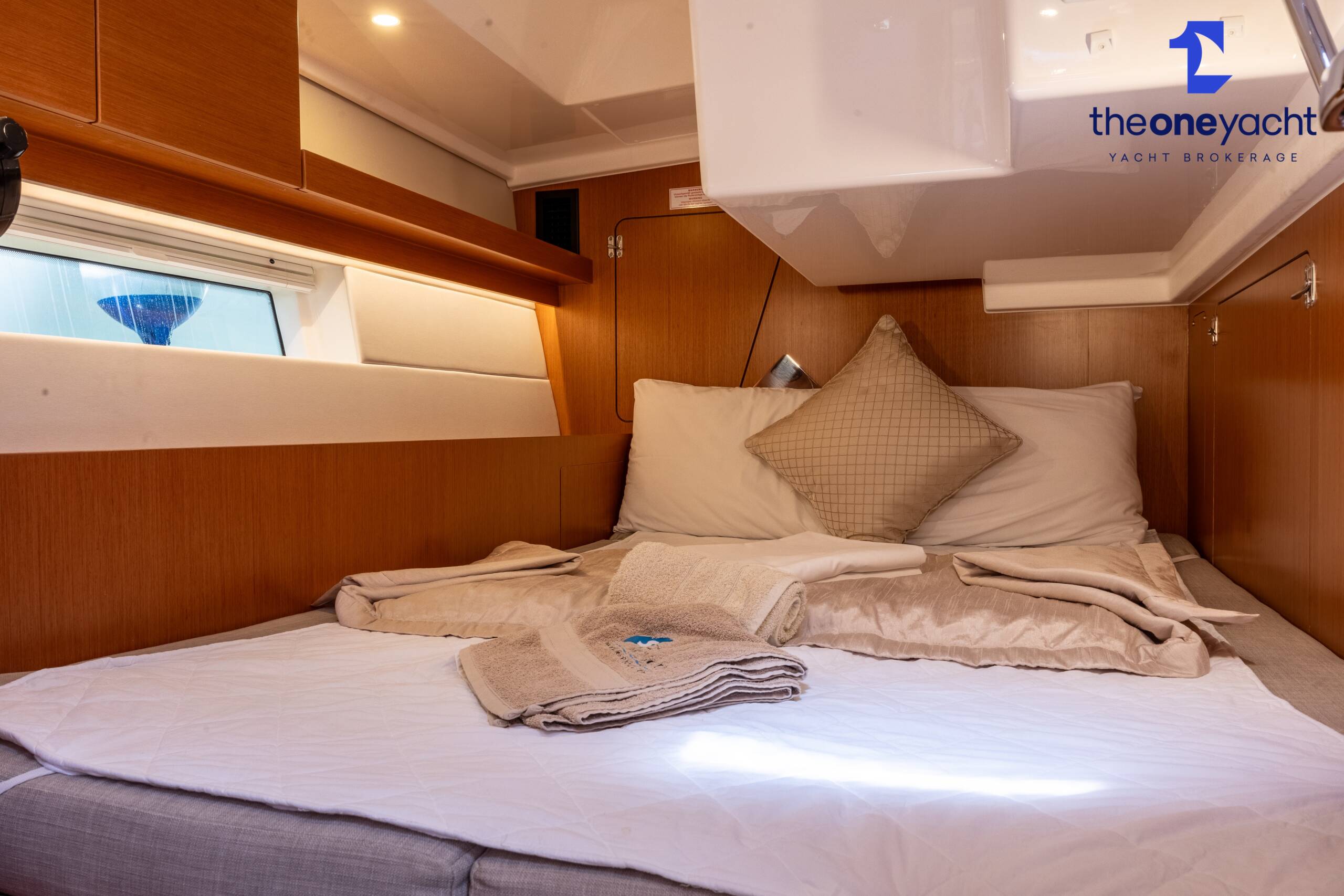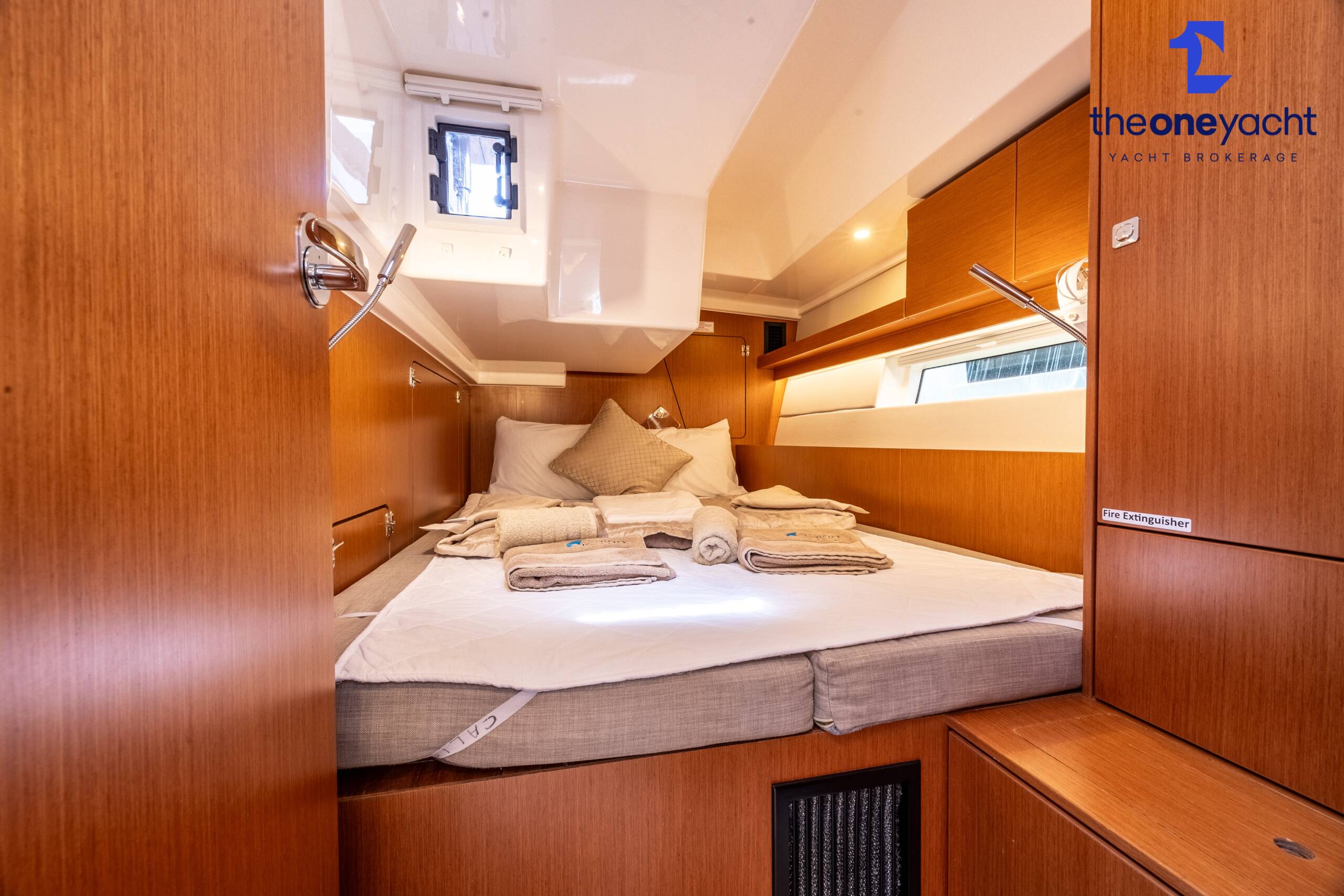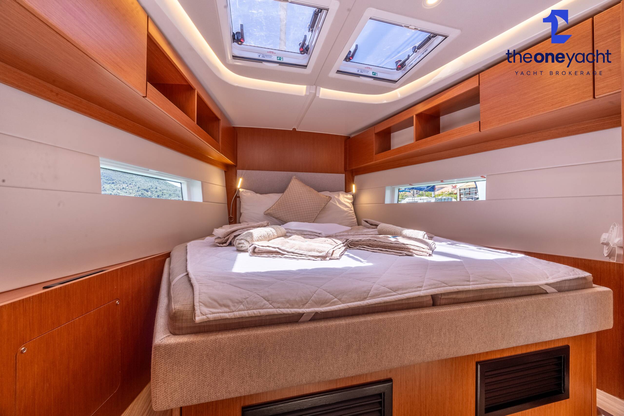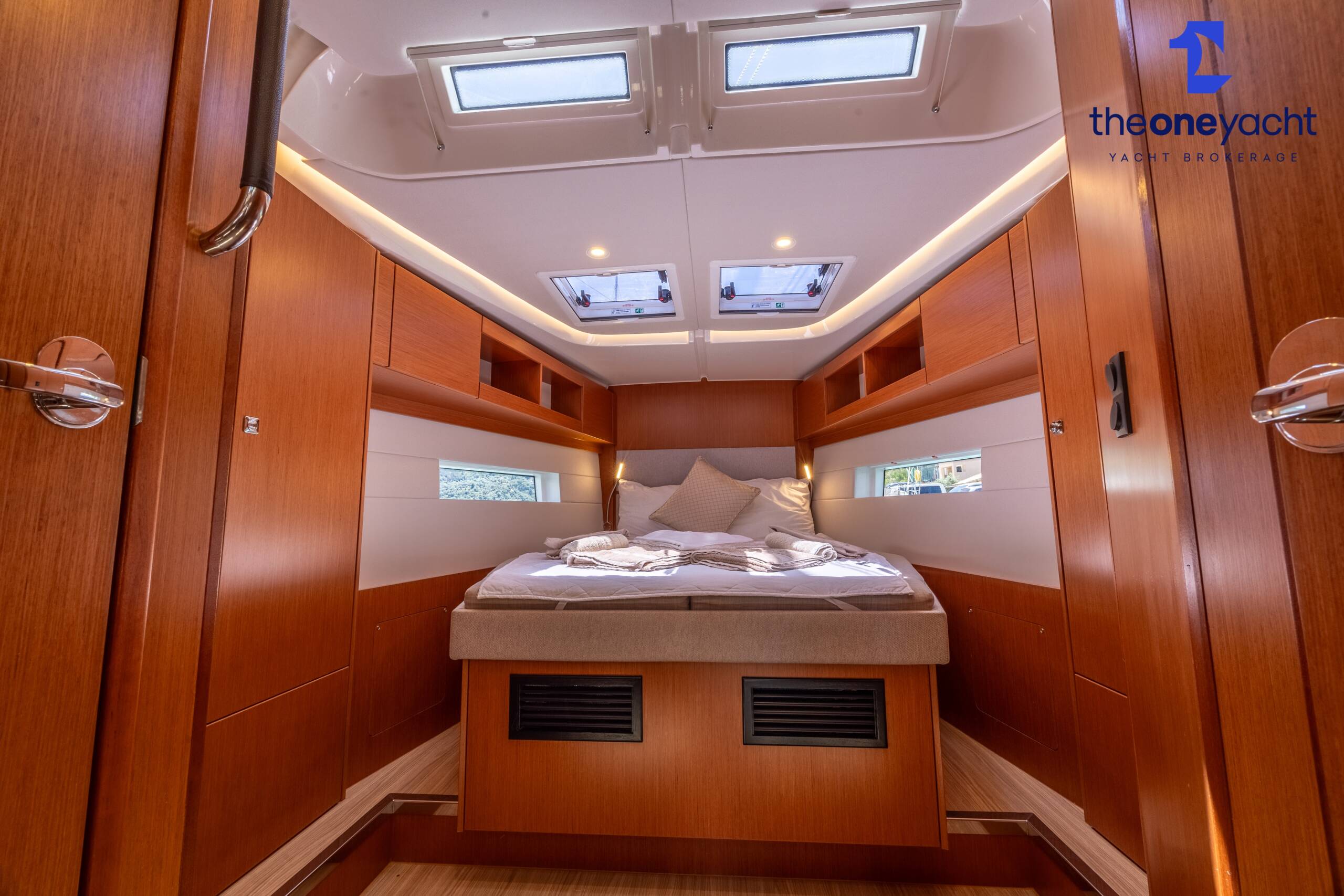 Calista features a spacious and versatile three-cabin layout with additional saloon berth conversion, creating comfortable accommodation for family cruising or charter guests. The forward owner’s cabin offers generous space and premium finishes, while two aft double cabins provide excellent guest accommodation. Her bright walnut-finished saloon is modern and elegant, featuring a lowerable electric dining table that converts into an additional double berth. Two well-appointed heads serve the yacht, including a highly desirable separate shower enclosure in the starboard aft compartment, offering exceptional practicality and comfort for longer stays aboard.
