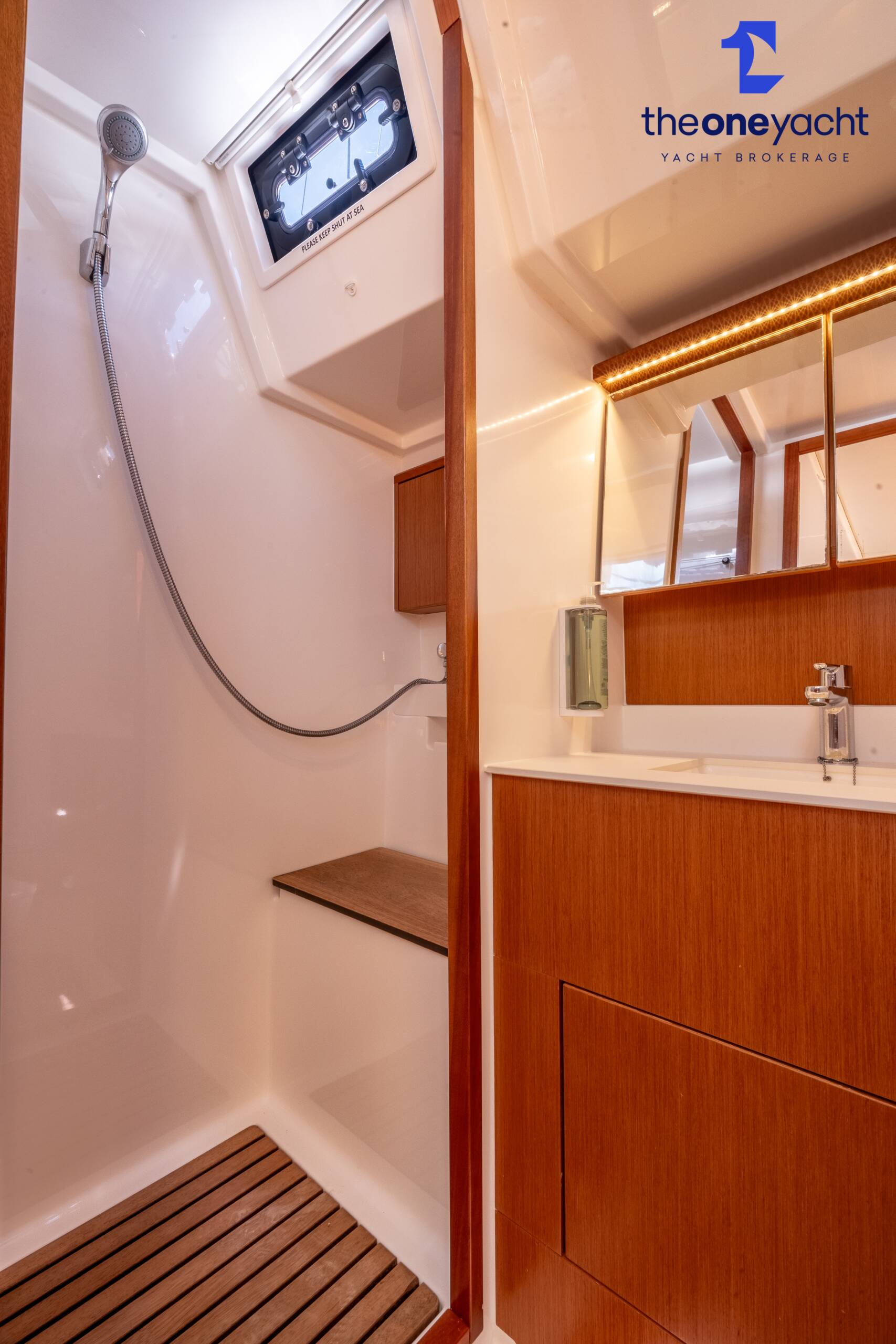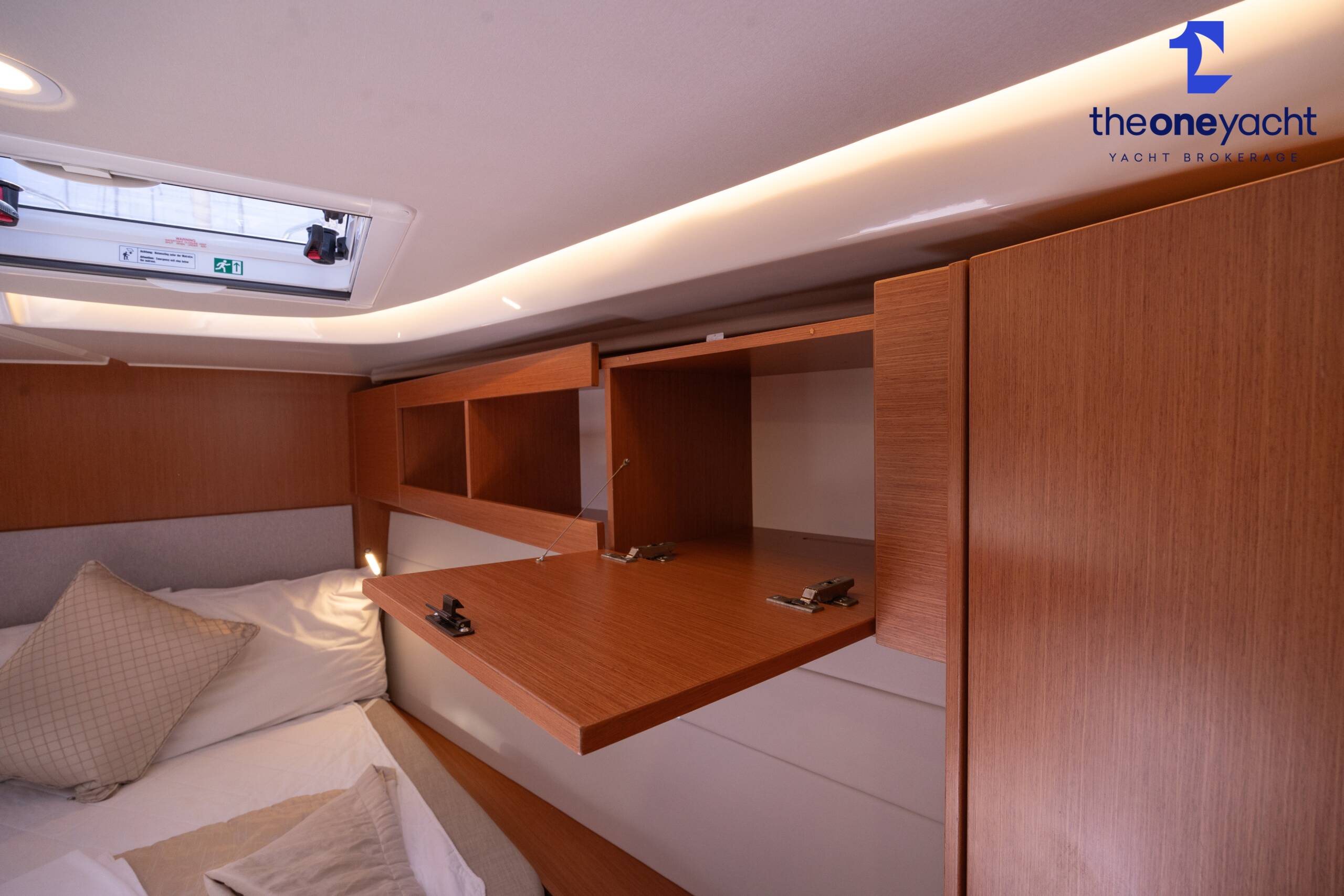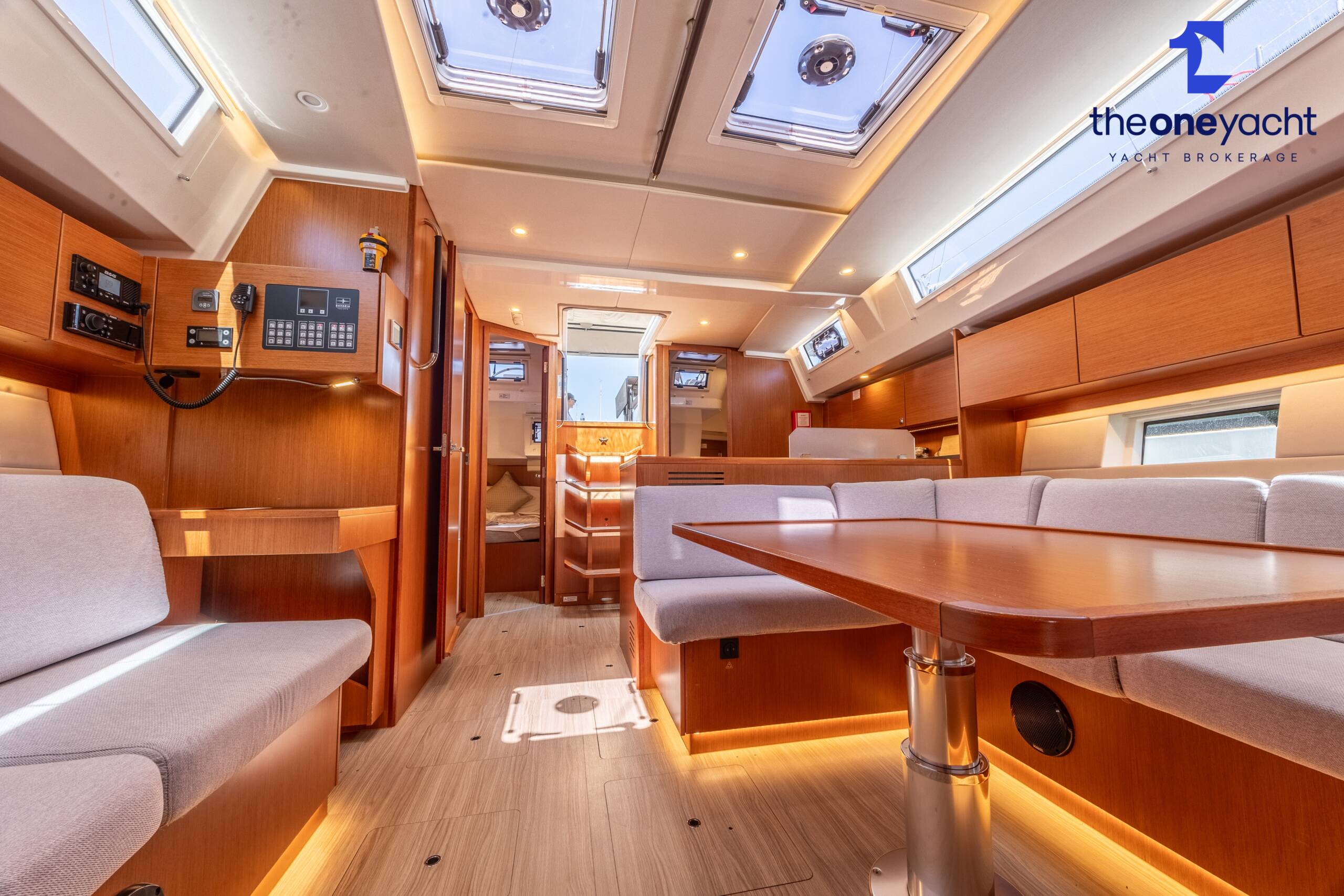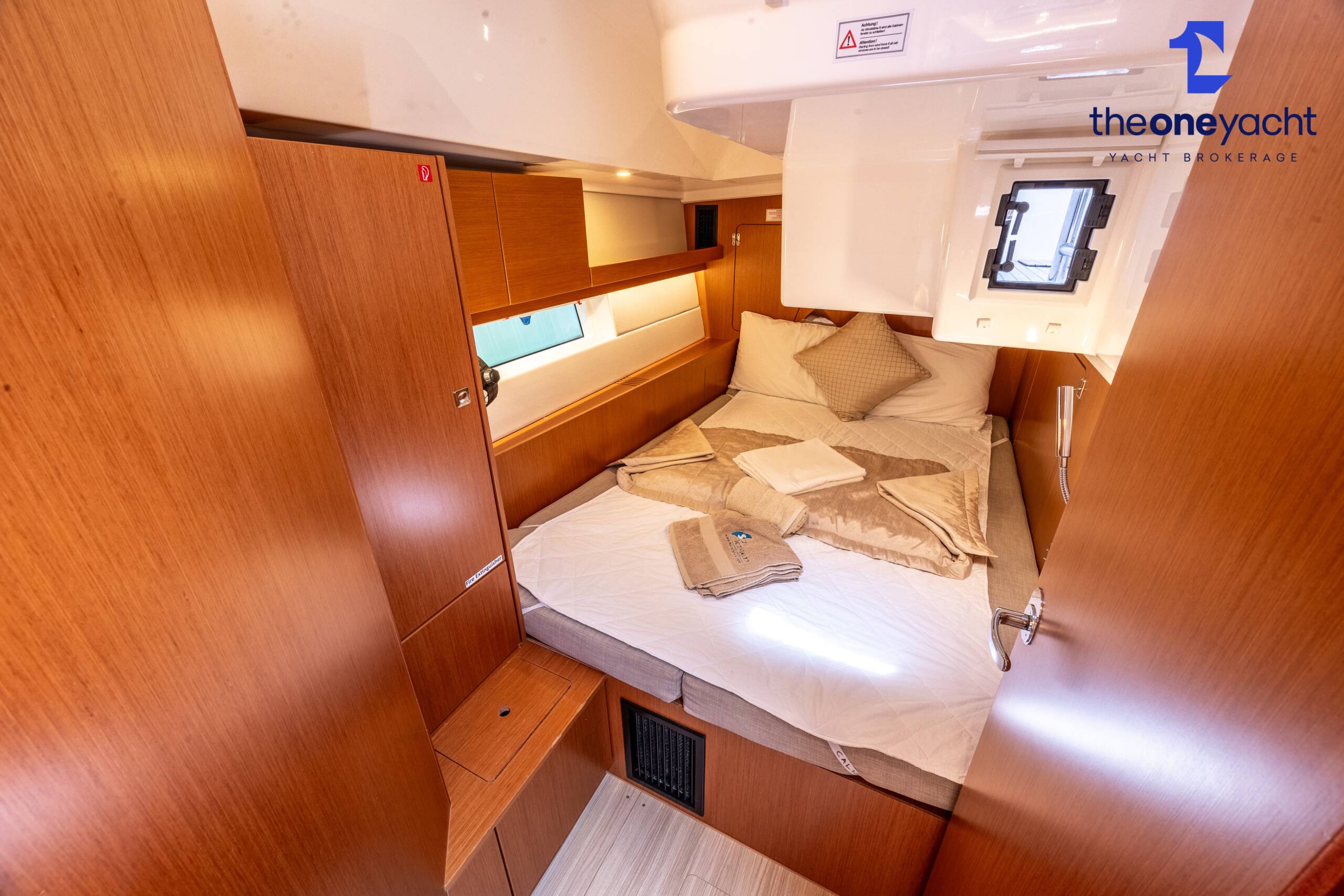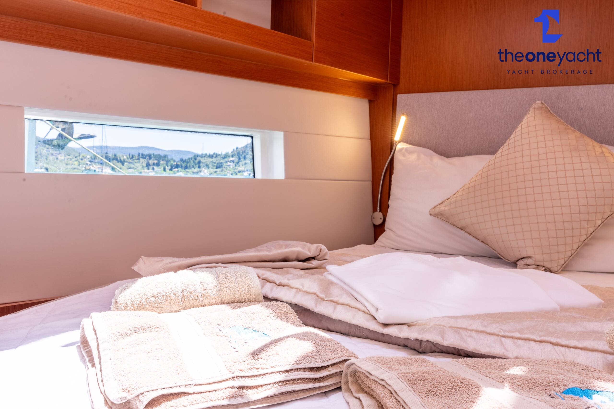 Calista features a spacious and versatile three-cabin layout with additional saloon berth conversion, creating comfortable accommodation for family cruising or charter guests. The forward owner’s cabin offers generous space and premium finishes, while two aft double cabins provide excellent guest accommodation. Her bright walnut-finished saloon is modern and elegant, featuring a lowerable electric dining table that converts into an additional double berth. Two well-appointed heads serve the yacht, including a highly desirable separate shower enclosure in the starboard aft compartment, offering exceptional practicality and comfort for longer stays aboard.