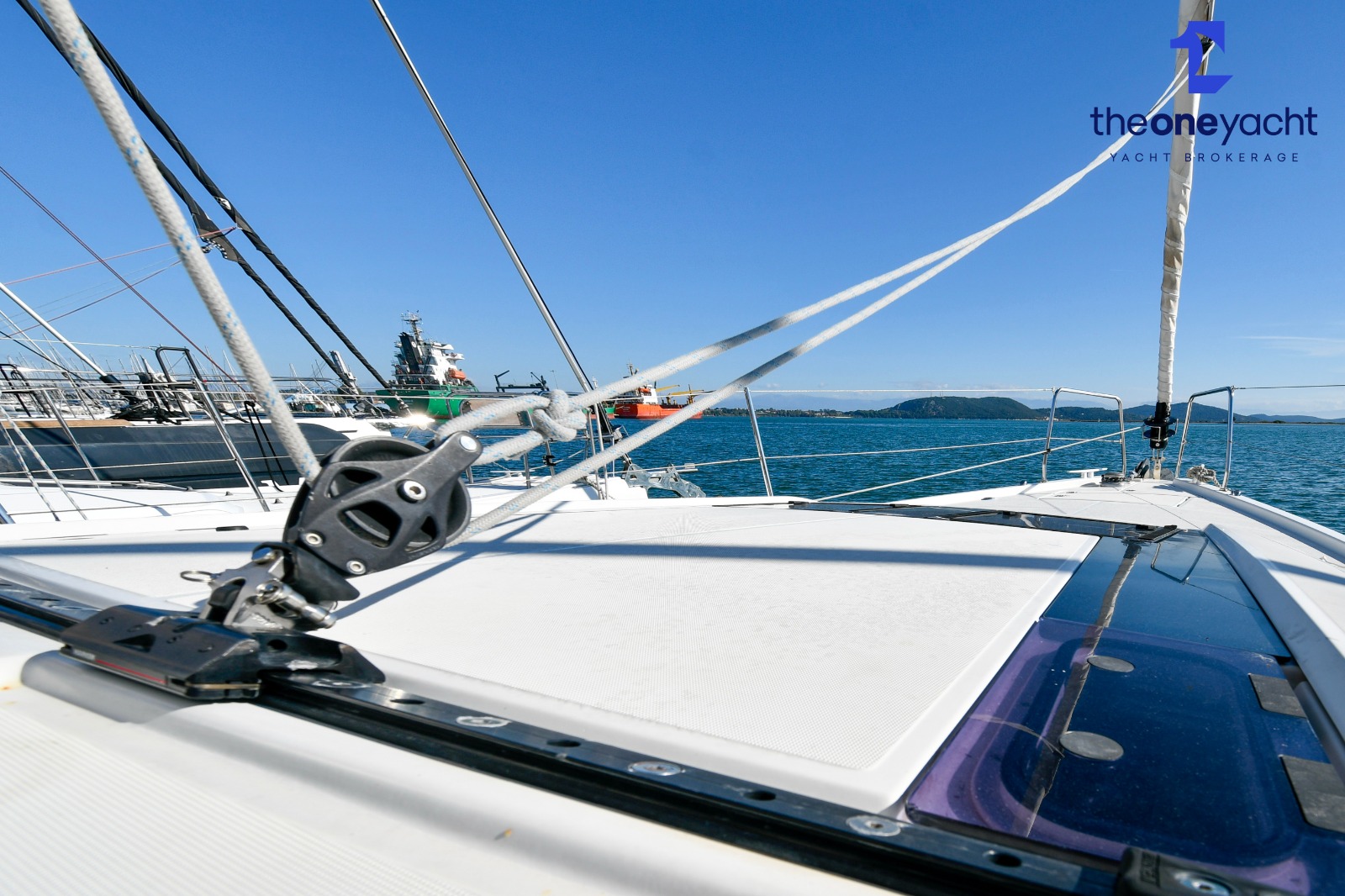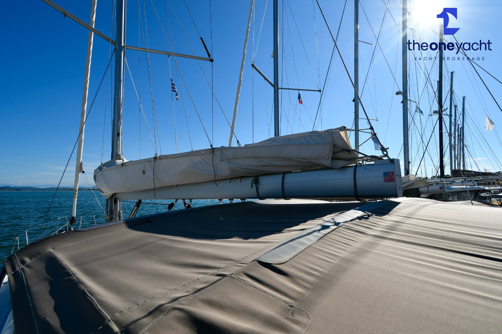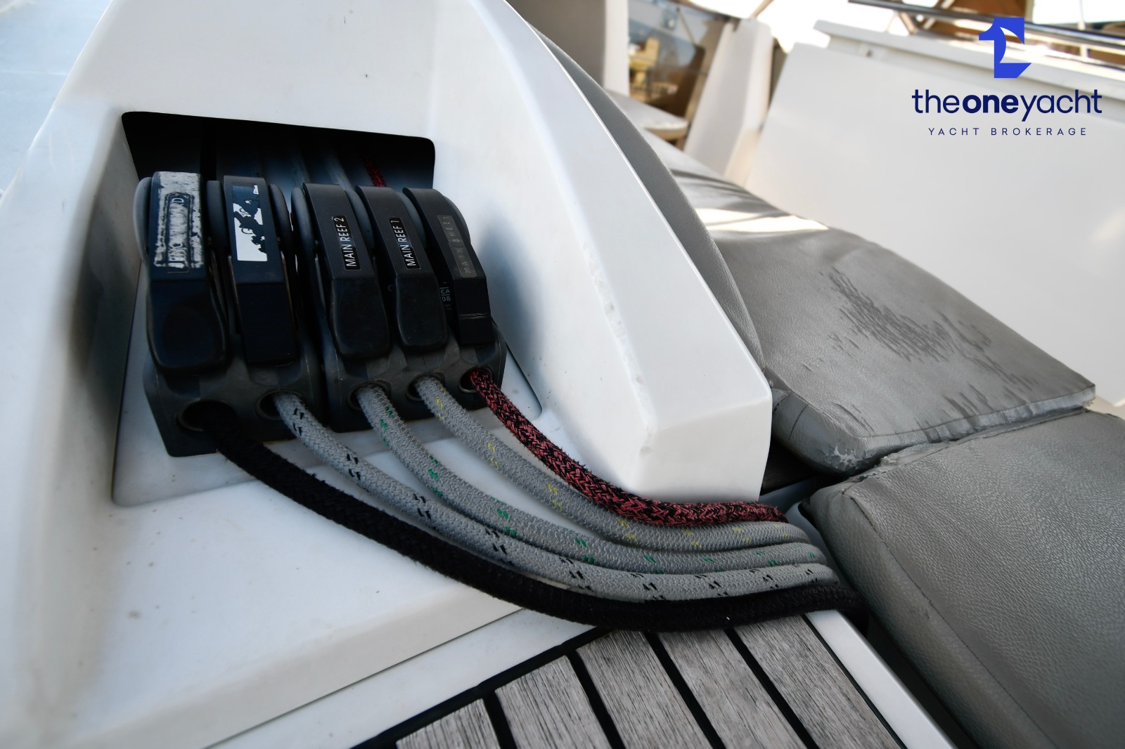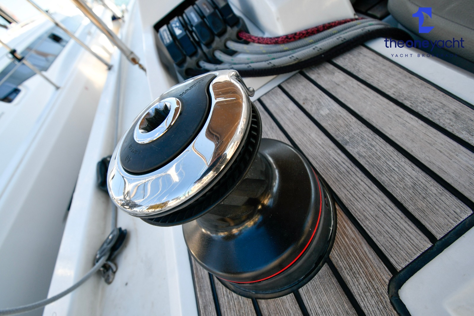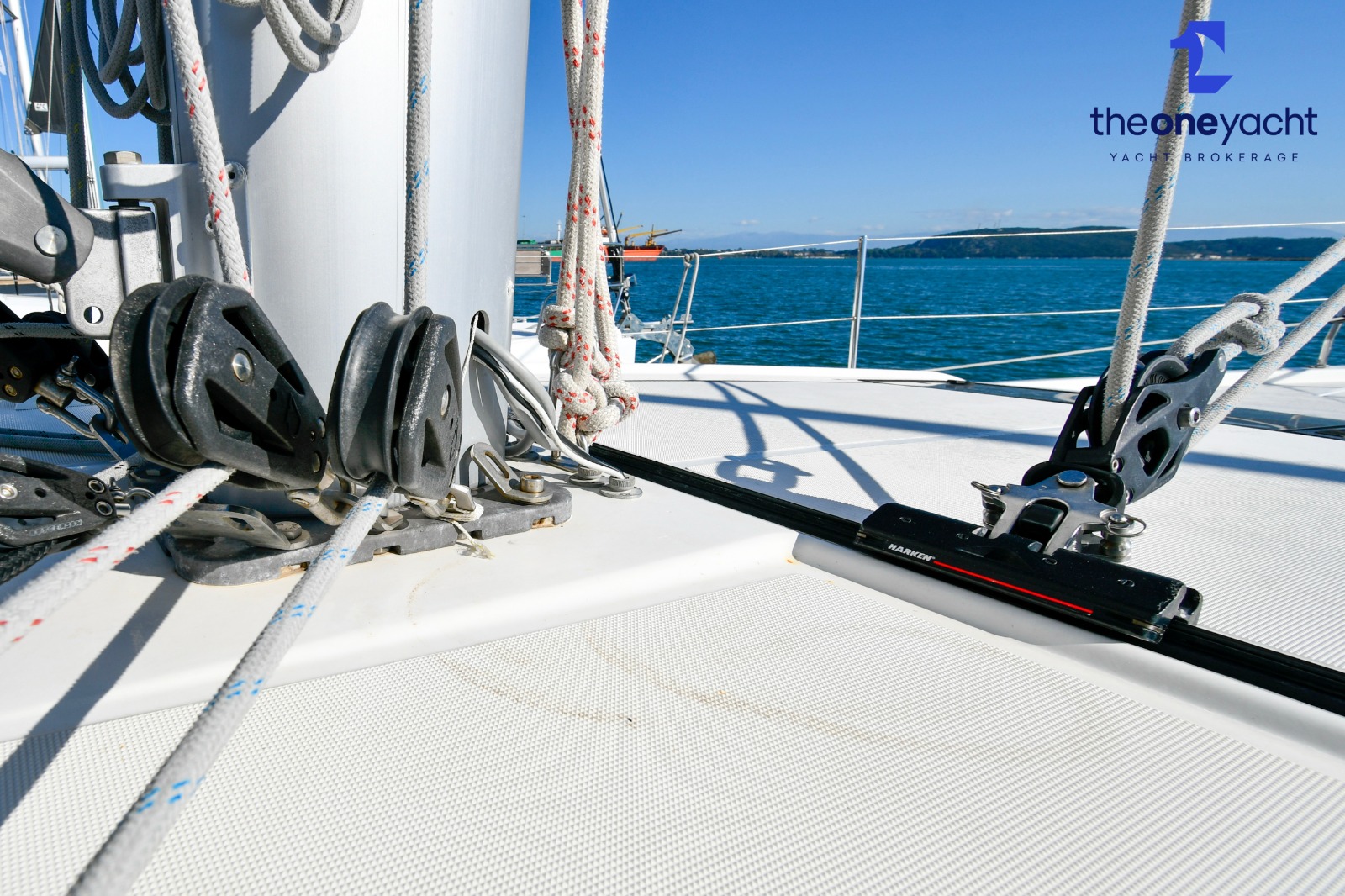 Notable onboard equipment and features include Dacron full-battened mainsail & roller-furling genoa self tacking, Cockpit-adjustable genoa traveler, clutches, and backstay, 80HP Yanmar engine – powerful and efficient, Bow thruster (Side Power) for easy docking and tight maneuvering, Fixed boomvang for precise sail control.