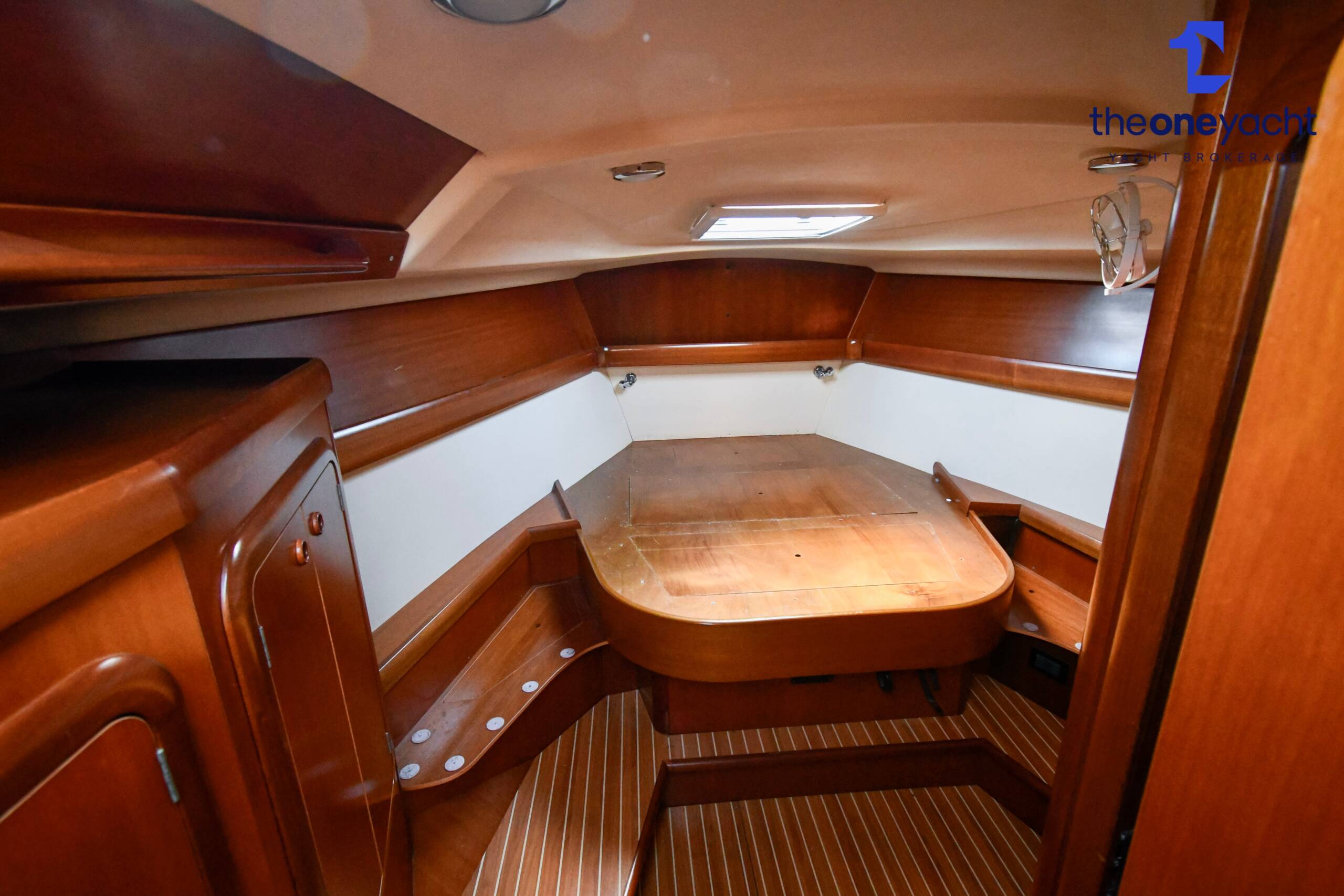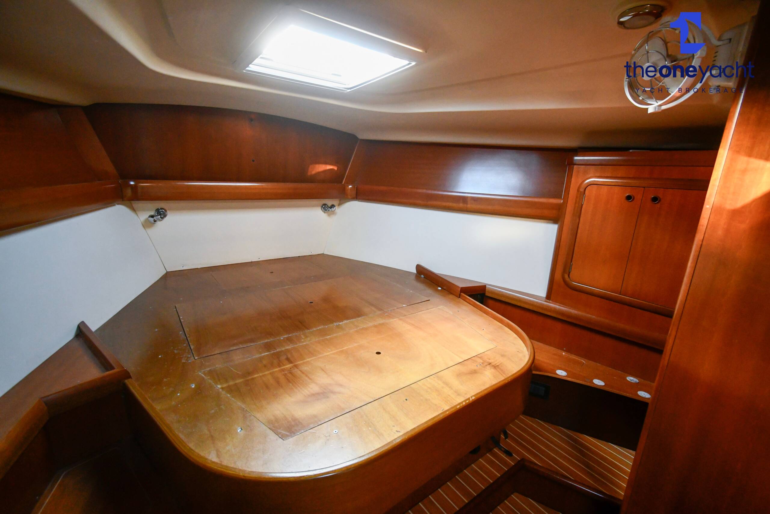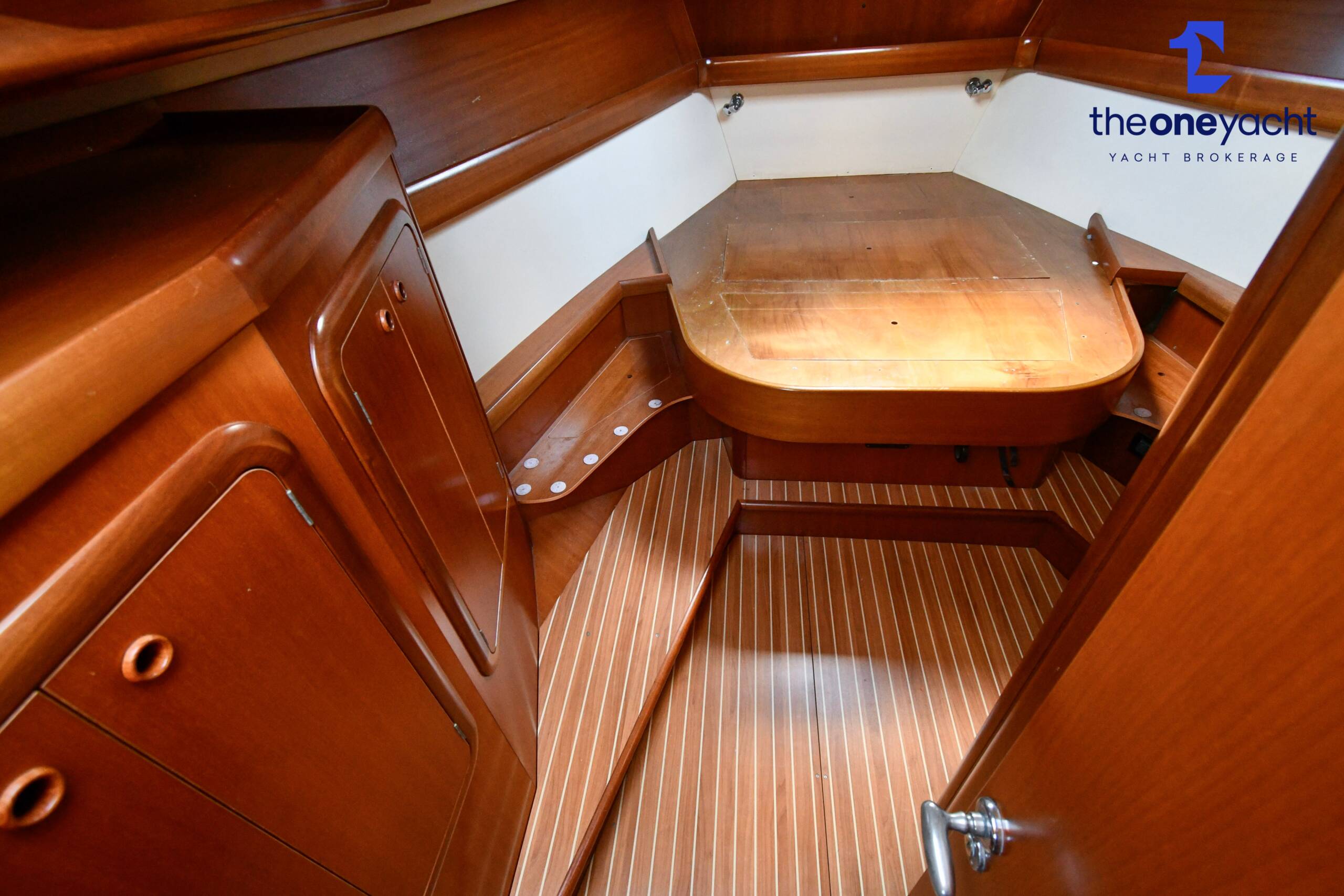The Grand Soleil 46.3 offers a spacious and intelligently arranged three-cabin layout that perfectly balances offshore practicality with luxurious onboard comfort. Alba Lunare features a generous forward owner’s cabin complete with private ensuite heads and separate shower, creating an impressive owner’s suite ideal for extended cruising or liveaboard use. Two aft double guest cabins provide comfortable accommodation for additional crew or family, while the large central saloon delivers a bright and welcoming social area with ample seating, dining space, and excellent natural light throughout. A well-appointed guest heads and shower serve the aft cabins, while the beautifully finished Corian galley offers abundant workspace and storage for longer passages. With accommodation for six plus an additional two berths in the saloon, the layout is highly versatile and exceptionally practical for both family cruising and entertaining onboard.