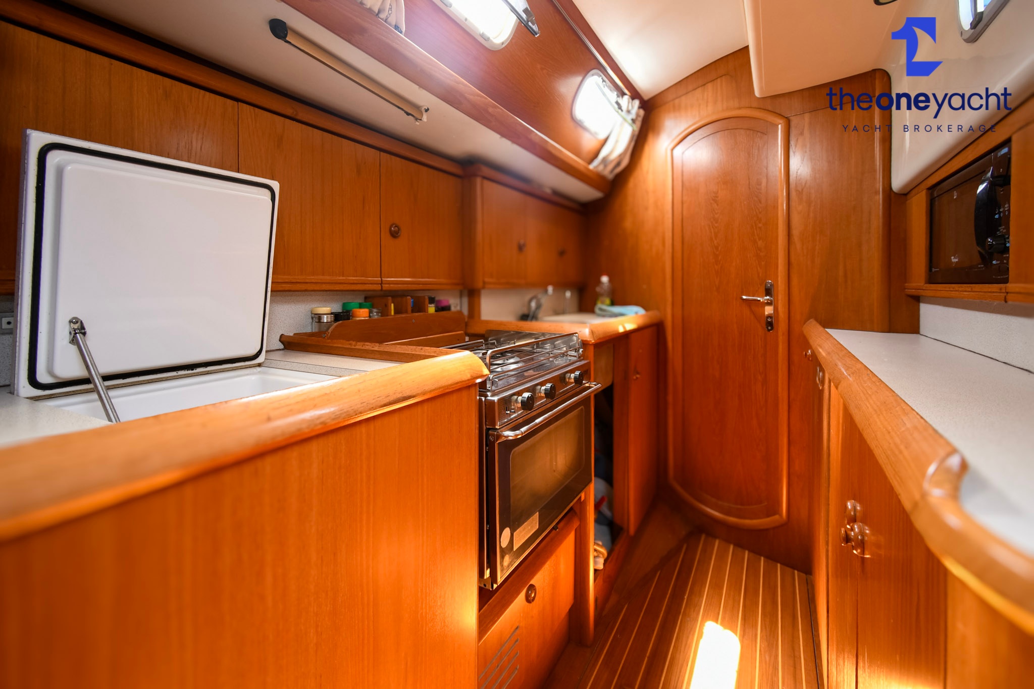 Pickle features the sought-after centre cockpit configuration that makes the Jeanneau Sun Odyssey 42 CC a superb liveaboard and long-distance cruising yacht. Her interior offers a spacious and practical two-cabin owner’s layout, with a generous forward guest cabin and a large aft owner’s suite accessed privately from the saloon. The aft cabin benefits from excellent storage, impressive headroom, and ensuite access, creating a comfortable private living area ideal for extended stays aboard. The bright central saloon provides ample seating and dining space, complemented by updated upholstery and curtains, while the practical galley offers generous workspace, twin sinks, and full cooking facilities. Her centre cockpit arrangement also creates excellent separation between accommodation spaces while improving protection and visibility underway.