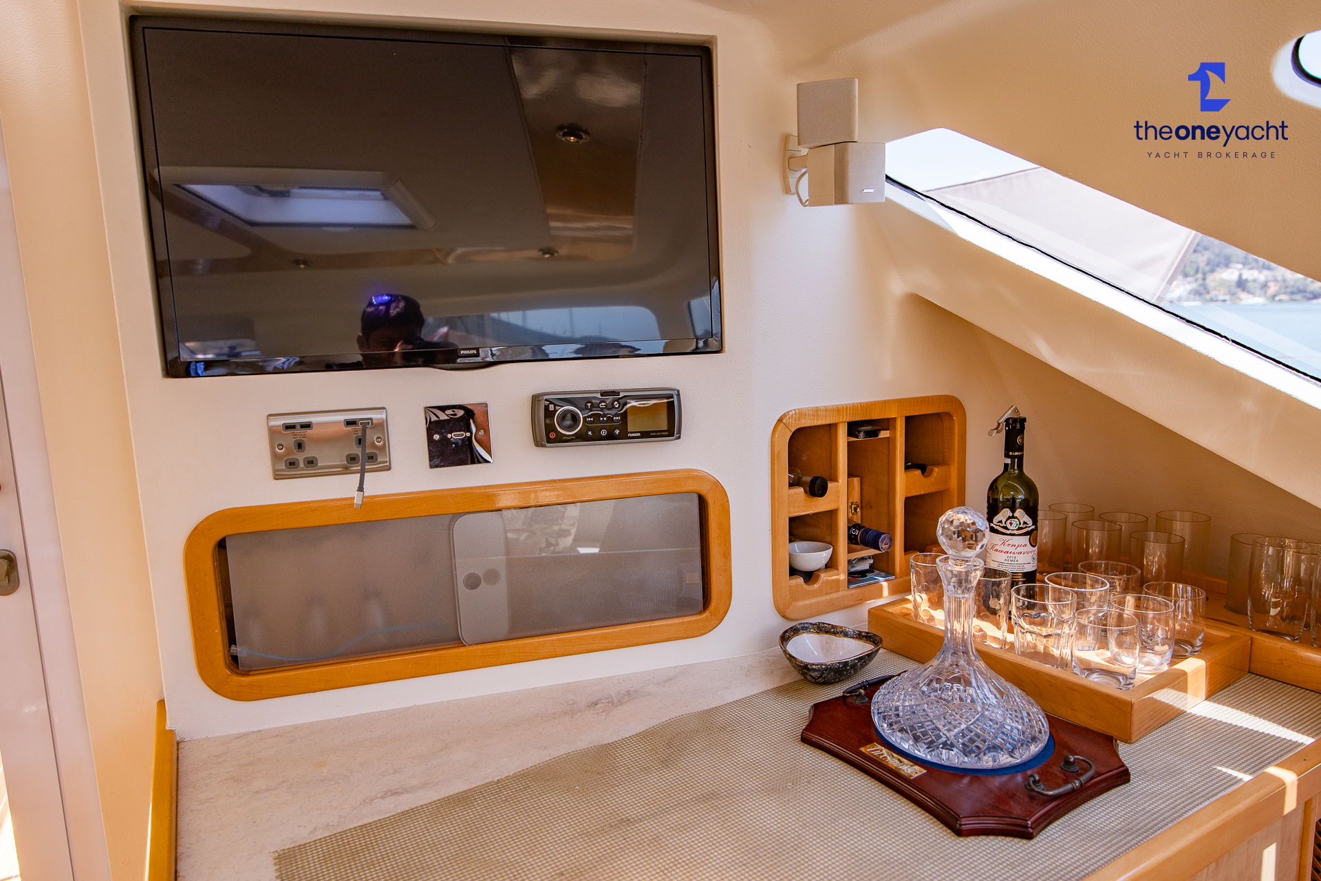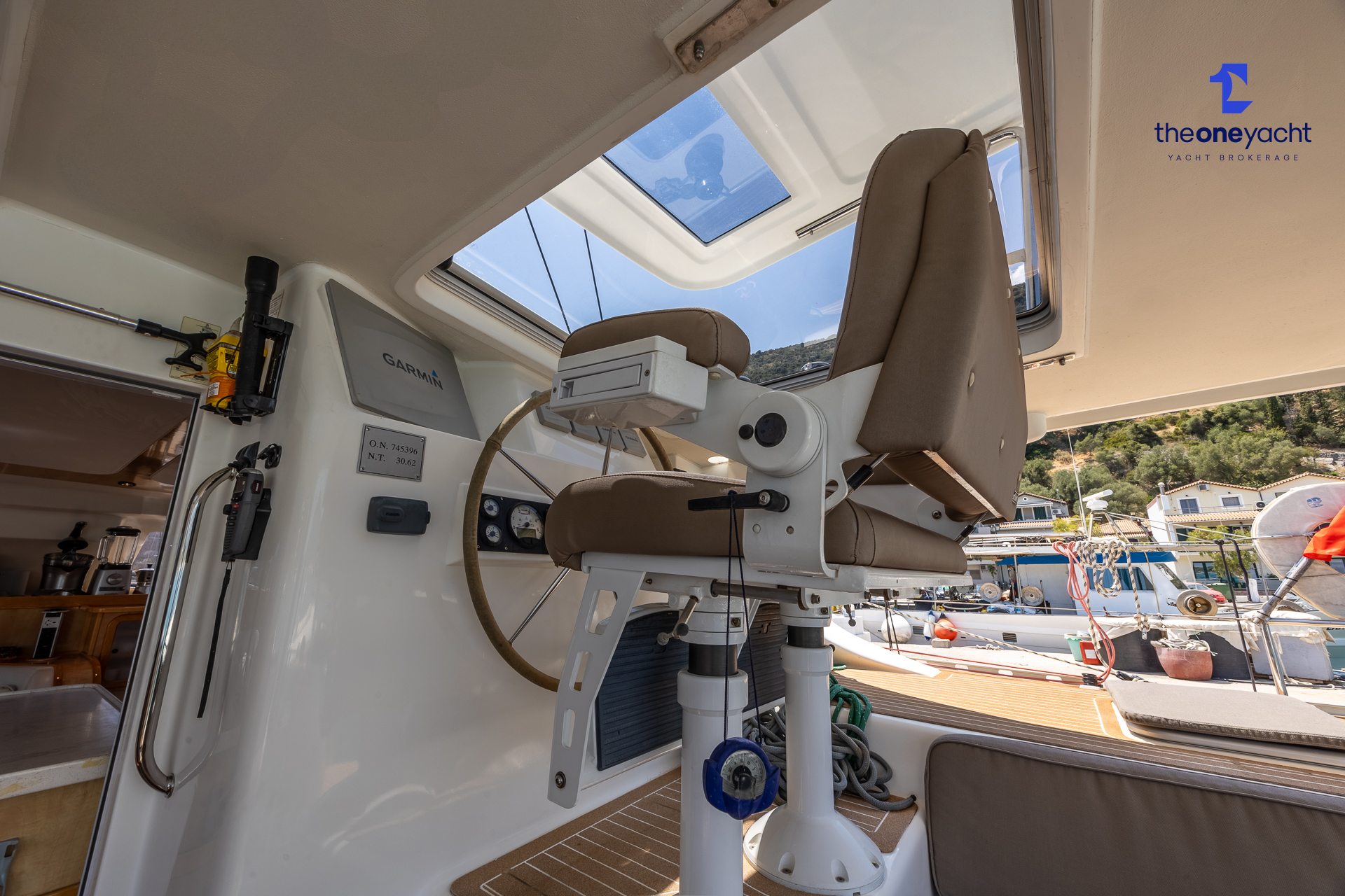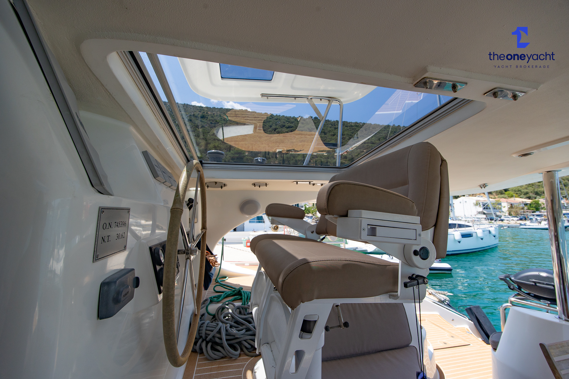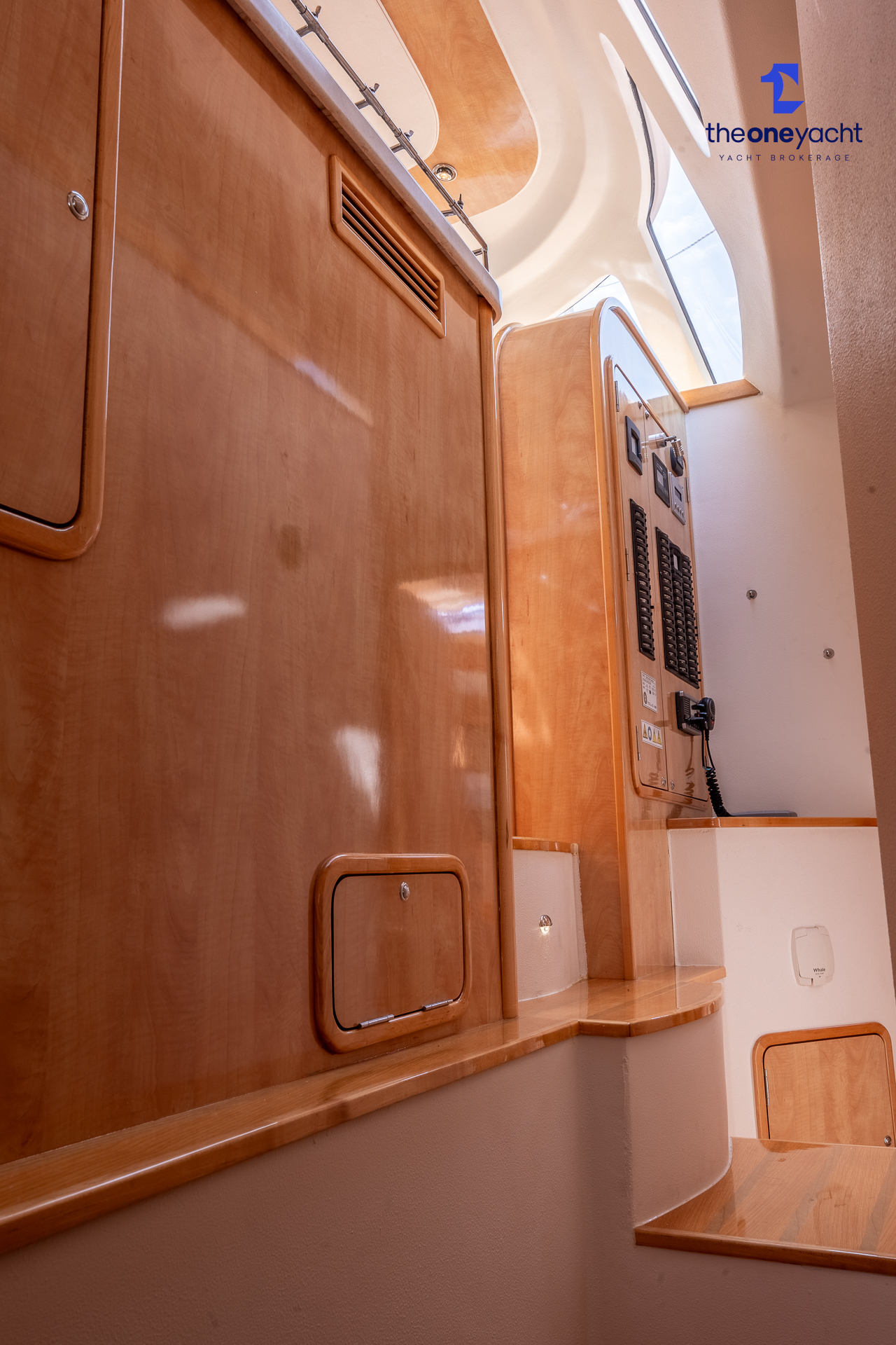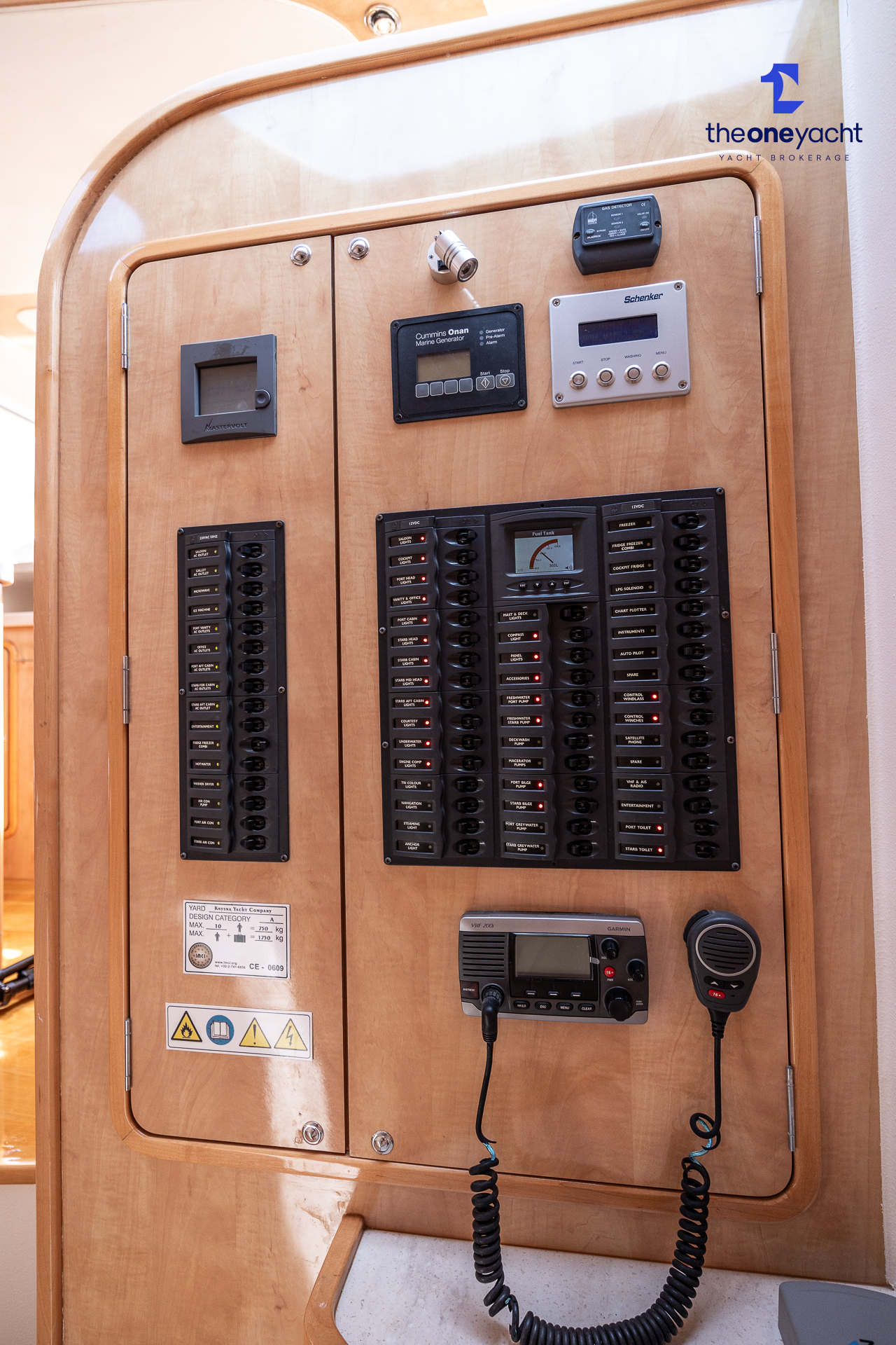 Navigation and onboard electronics include Garmin full navigation suite comprising Garmin radar, Garmin AIS Transceiver 600, Garmin VHF with remote helm console, Garmin autopilot, Garmin 8015 15” touchscreen chart plotter, and Garmin navigation instrumentation throughout. Her comprehensive electronics package delivers advanced navigation and situational awareness for serious offshore cruising.